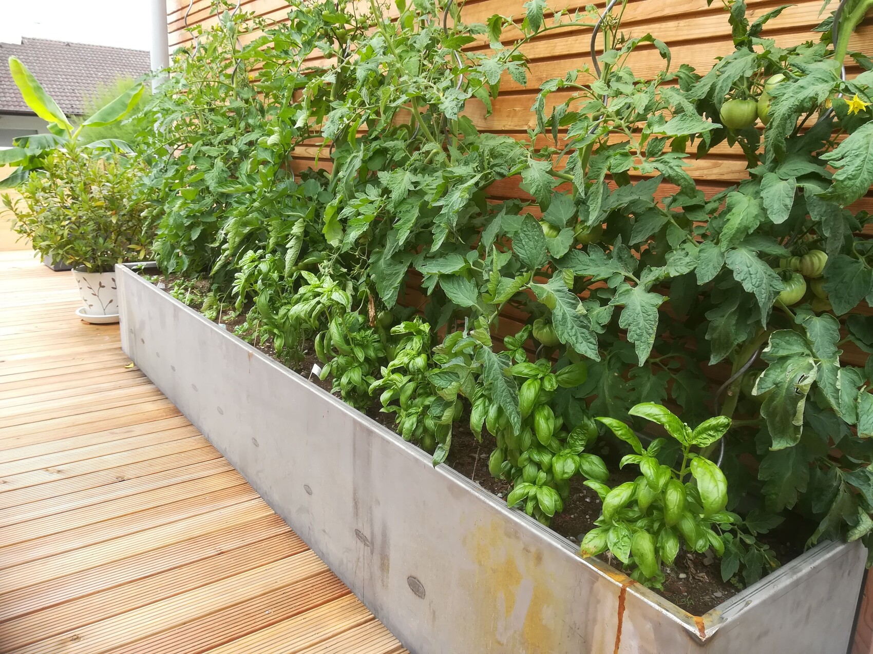 Dazwischen habe ich Basilikum gepflanzt und gesät, weil mir eine alte Bäuerin gesagt hat, daß Tomaten und Basilikum sich gegenseitig begünstigen. Offenbar hat sie recht: