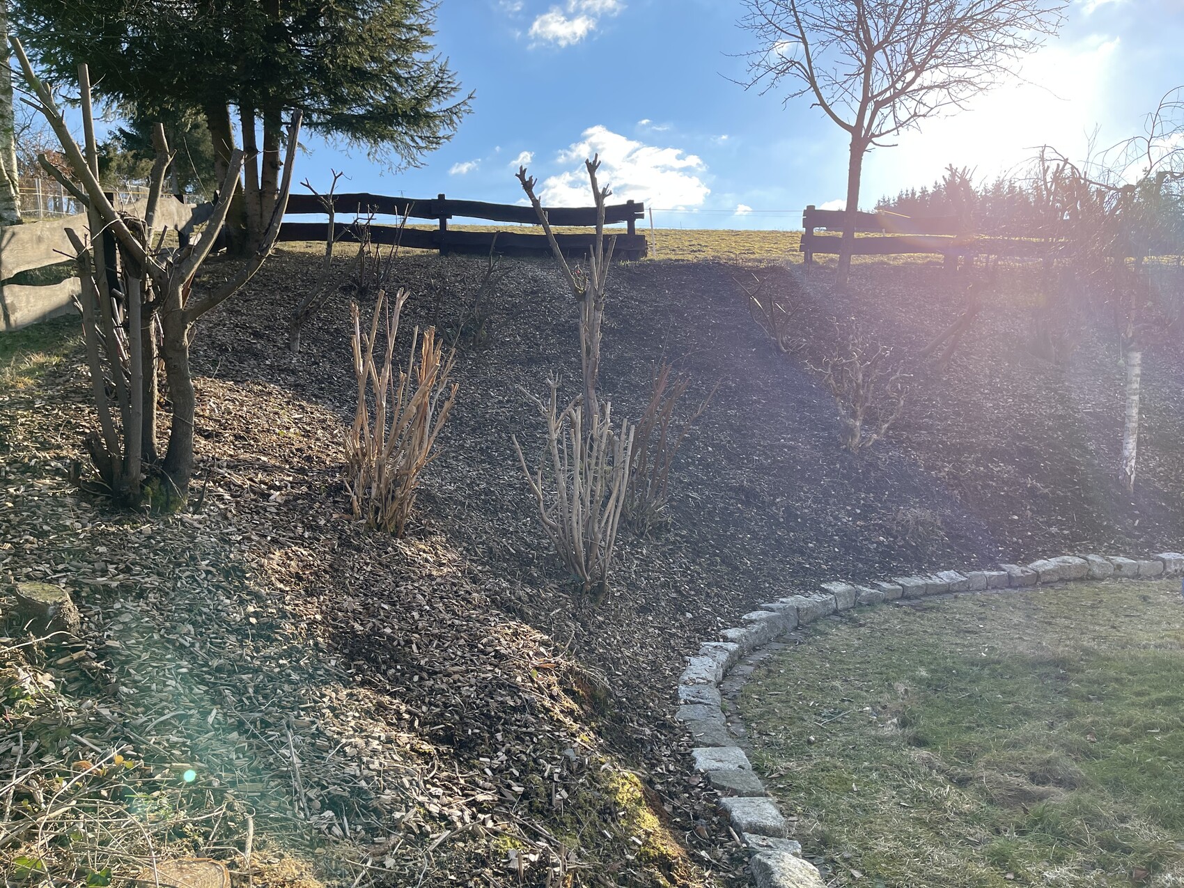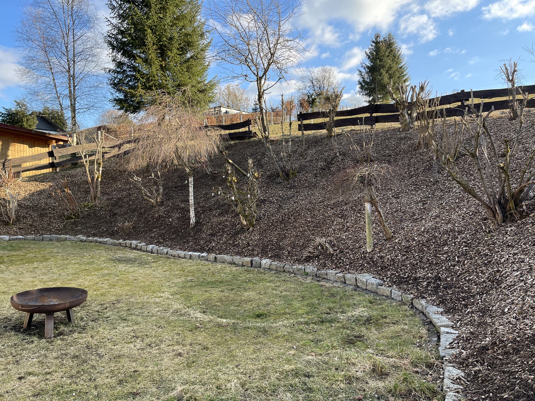 Schimi179106.03.21 12:30Wir hatten letzte Nacht minus 12 Grad C. Da ist noch nicht viel mit Gartenarbeit. Allerdings werden die Vorbereitungen schon getroffen. So machen wir uns darüber Gedanken, wie wir unseren Hang gestalten sollen. Der ist wirklich recht steil und die Hackschnitzel sacken durch Regen etc. nach unten. Der "Rasen" ist noch eine (ganz) andere Baustelle. Die Überlegungen gehen dahin, zu versuchen, kleinere Terrassen einzubauen, damit man besser am Hang arbeiten kann.
