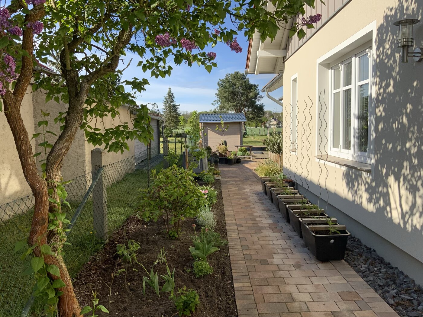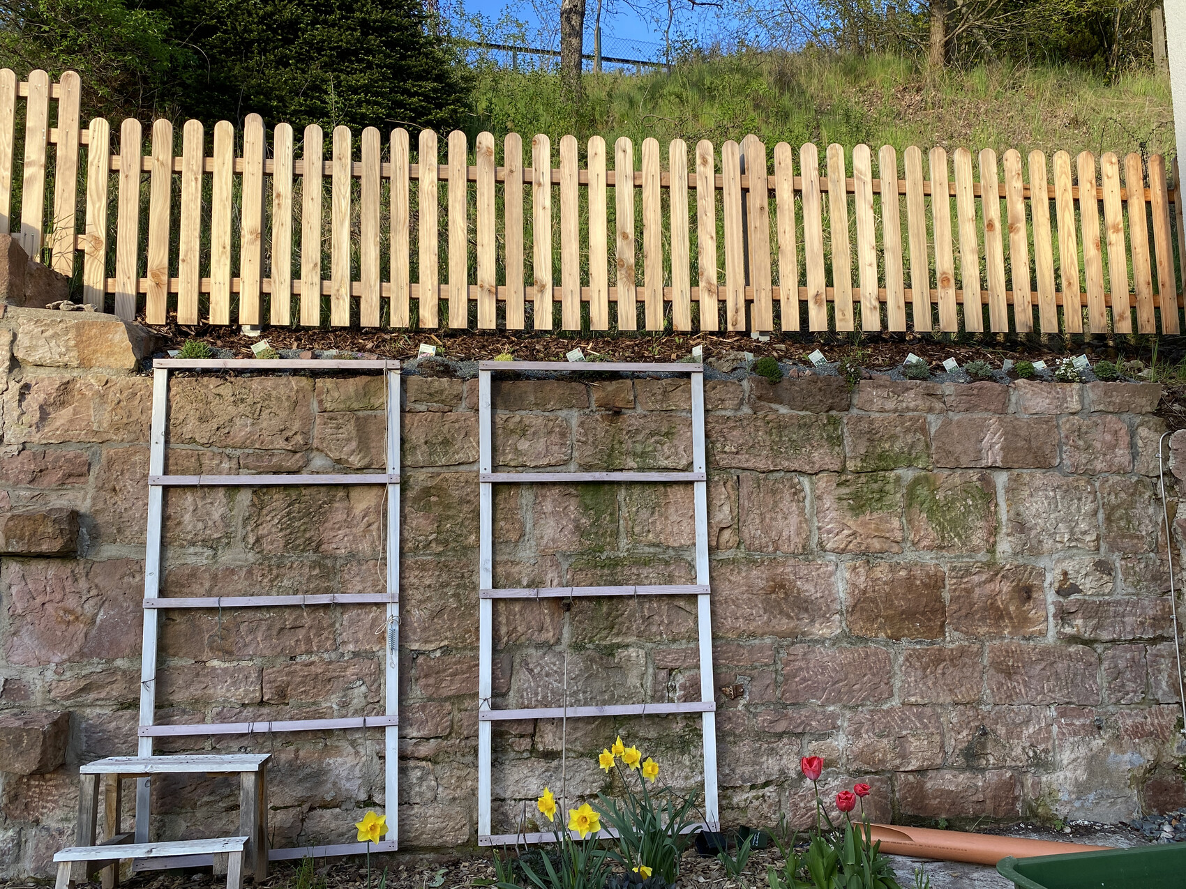 An Stelle des Lattenzaunes kommt im Juli eine Photovoltaikanlage auf drei Seiten. (Ost-Süd-West)