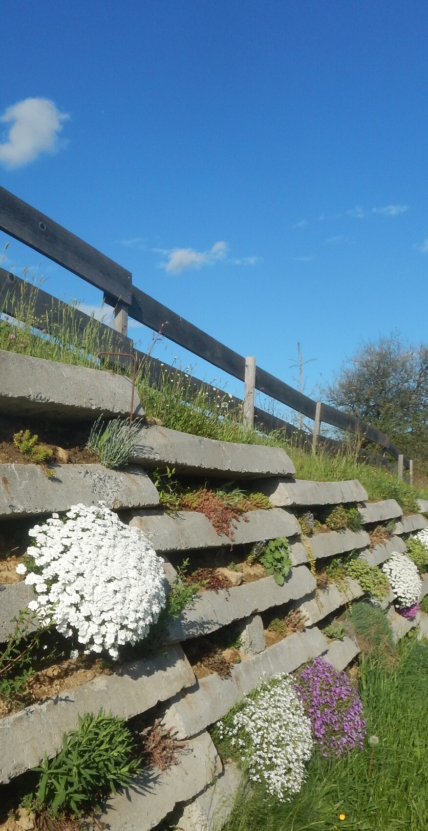 Heute zeig ich euch wieder mal die Stützmauer aus alten Bahnschwellen von unseren Jungen, die ich zwei mal jährlich mit großer Freude pflegen darf. Ich pflanze fast nur geschenkte Polsterstauden, die auch die Sommerhitze vertragen.