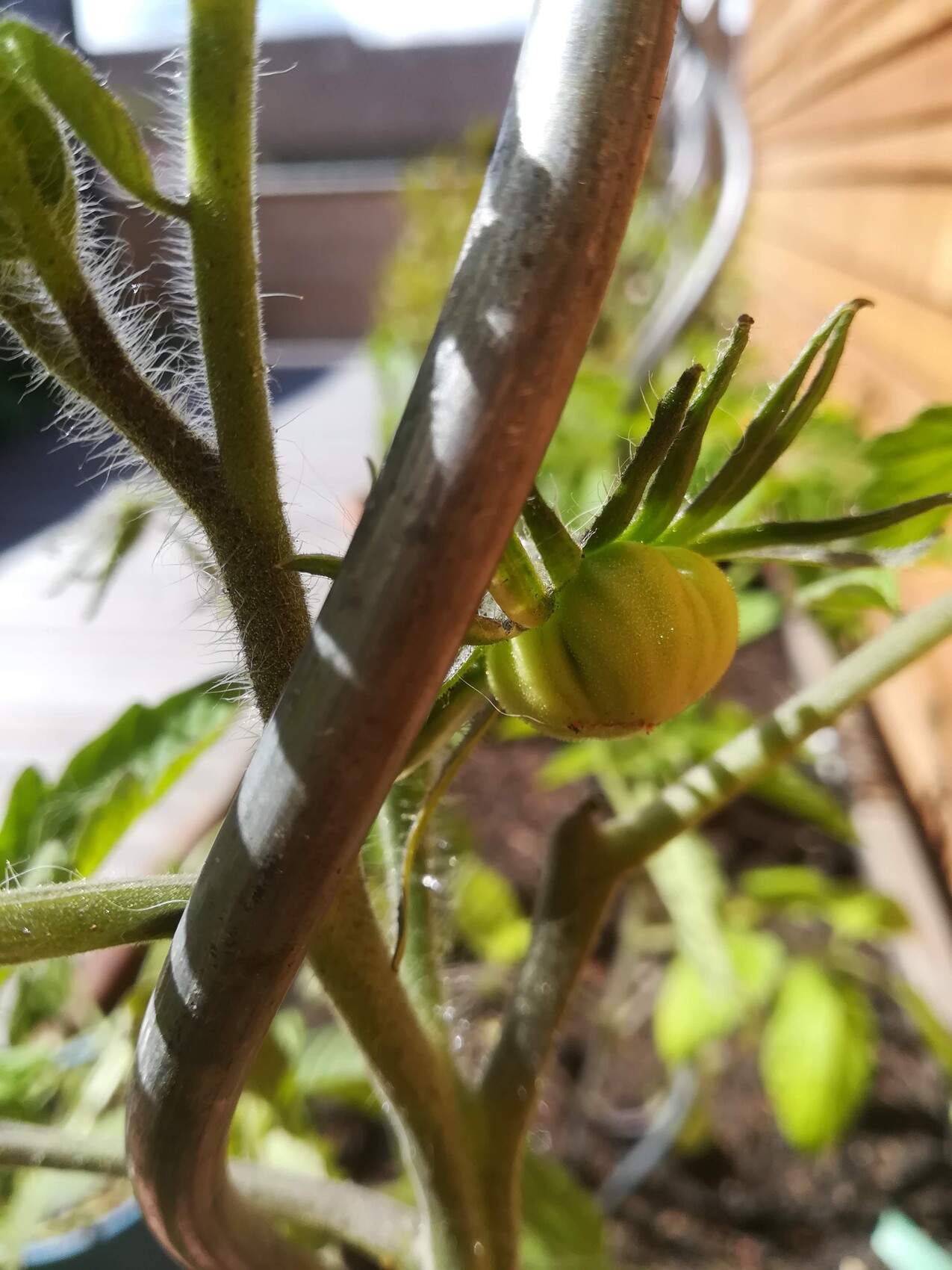 Und meine Tomatenpflanzen sind auch schon draußen und eine erste, ganz wagemutige Tomate hat sich schon gebildet: