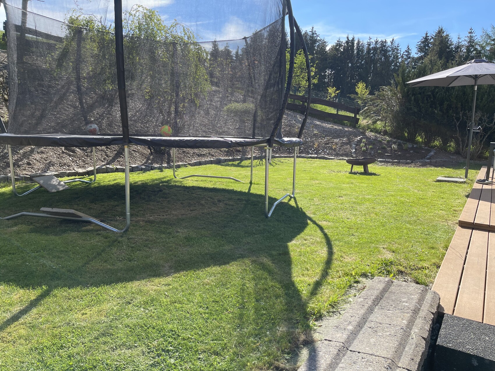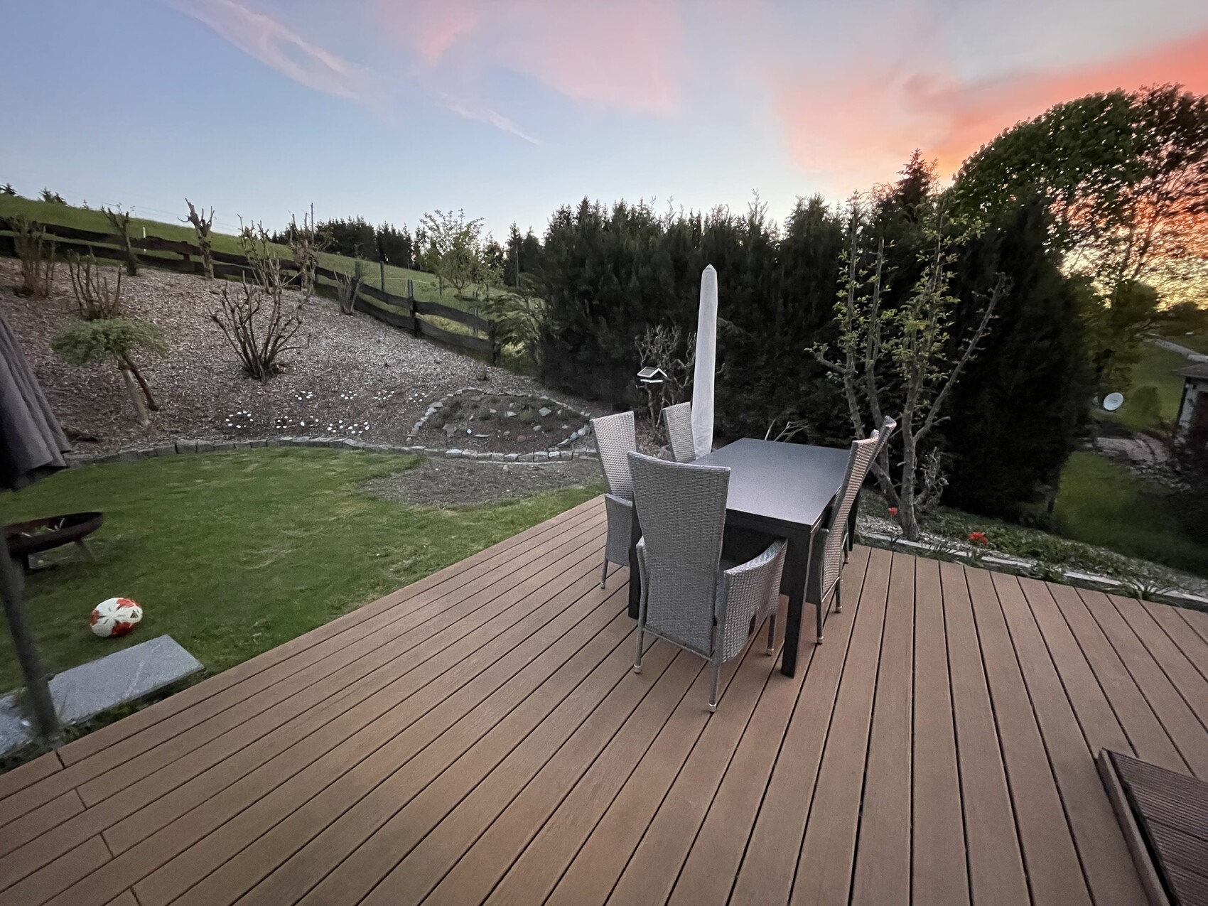 Meine Frau hat vor einiger Zeit eine "Blumenwiese" - ein schmaler Streifen neben unserer Terrasse - gesät. Zu sehen sind bisher nur einige Millimeter eínes undefinierten grünen "Etwas" 🙄 Mit etwas Fantasie erkennt man es im Bild rechts neben dem Tisch. Das Bild ist von gestern Abend. Auch versucht sie sich tapfer an einem Kräuterbeet, zu erkennen im Bild links vom Tisch.