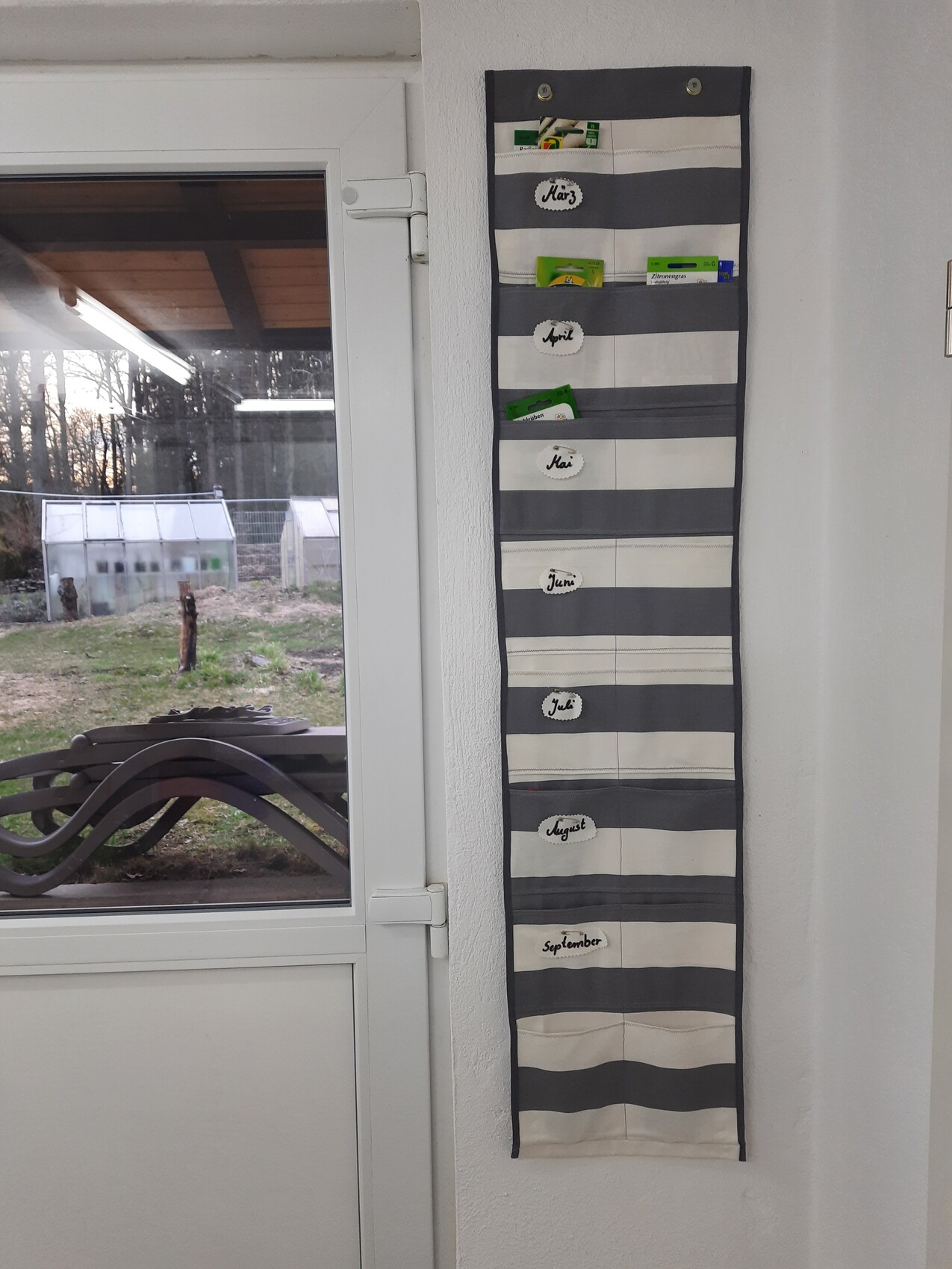 Fummelbrett!14.06.21 23:56...und ich freue mich immer wieder über meinen kleinen Helfer, den ich mir im Frühjahr genäht habe: Den Samentütchenorganizer! Die letzten Jahre habe ich es nie auf die Reihe gebracht, zur richtigen Zeit bzw. überhaupt nachzusäen. Im Frühjahr hatte ich mir immer die tollsten Sachen vorgenommen, aber dann habe ich spätestens im August beim Blick in das Samentütchenregal resigniert. Da musste etwas Übersicht rein. So kann ich nun im Frühjahr das Ding bestücken und sehe, was später noch gesät werden soll/kann. Auch so kleine "Immer-Nachsäen-Sachen" wie Radiesal und Salat haben dort griffbereit ihren Platz am Ausgang zum Garten.