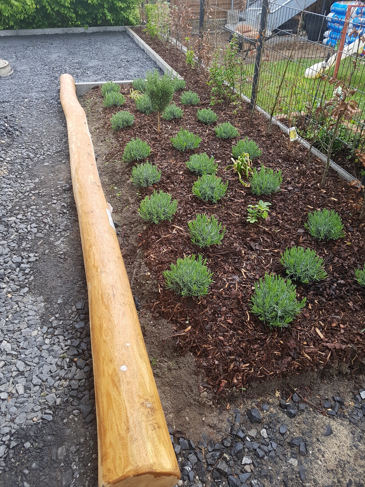 Hier noch ein paar Fotos von unserer heutigen Materiallieferung und unseren Beet im Vorgarten. Mit Lavendel für die Bienen. Der Baumstamm kommt noch nach hinten in den Garten als Sandkastenbegrenzung.