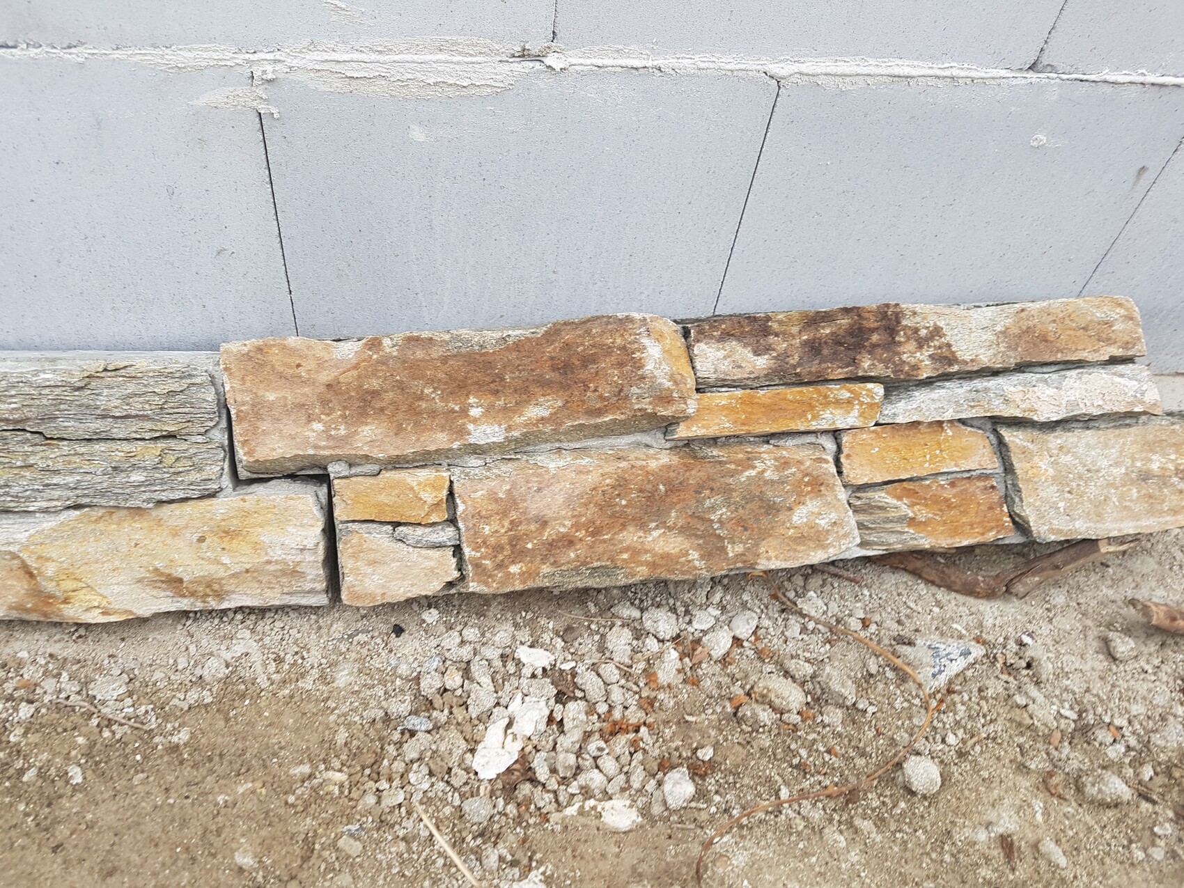 L-Steine zum Nachbarn hat er gesetzt, Zaun aufgestellt und 9 Meter Mauer erstellt, die mit Natursteinriemchen verbledendet wird. Morgen wird die unterste Steinreihe fürs Hühnerhaus gemauert. Das wird ebenfalls mit den Naursteinriemchen verblendet.