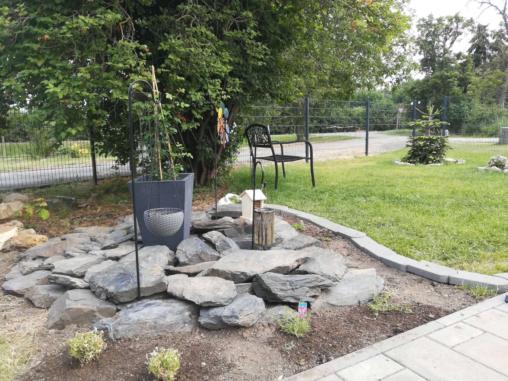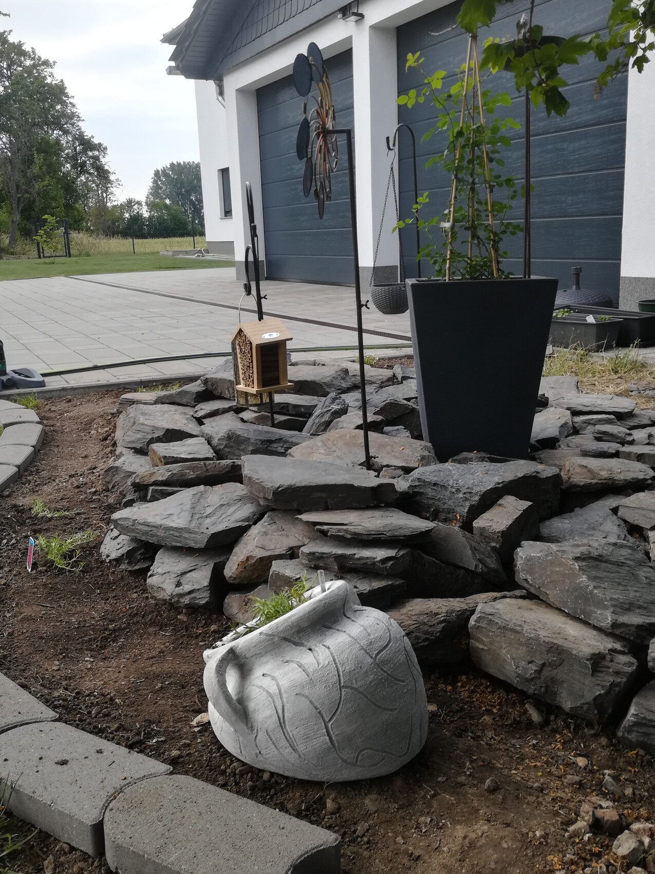 Vorn im Eingangsbereich aus Schiefersteinen einen kleinen Steingarten angefangen zu bauen. Ist aber noch nicht fertig.