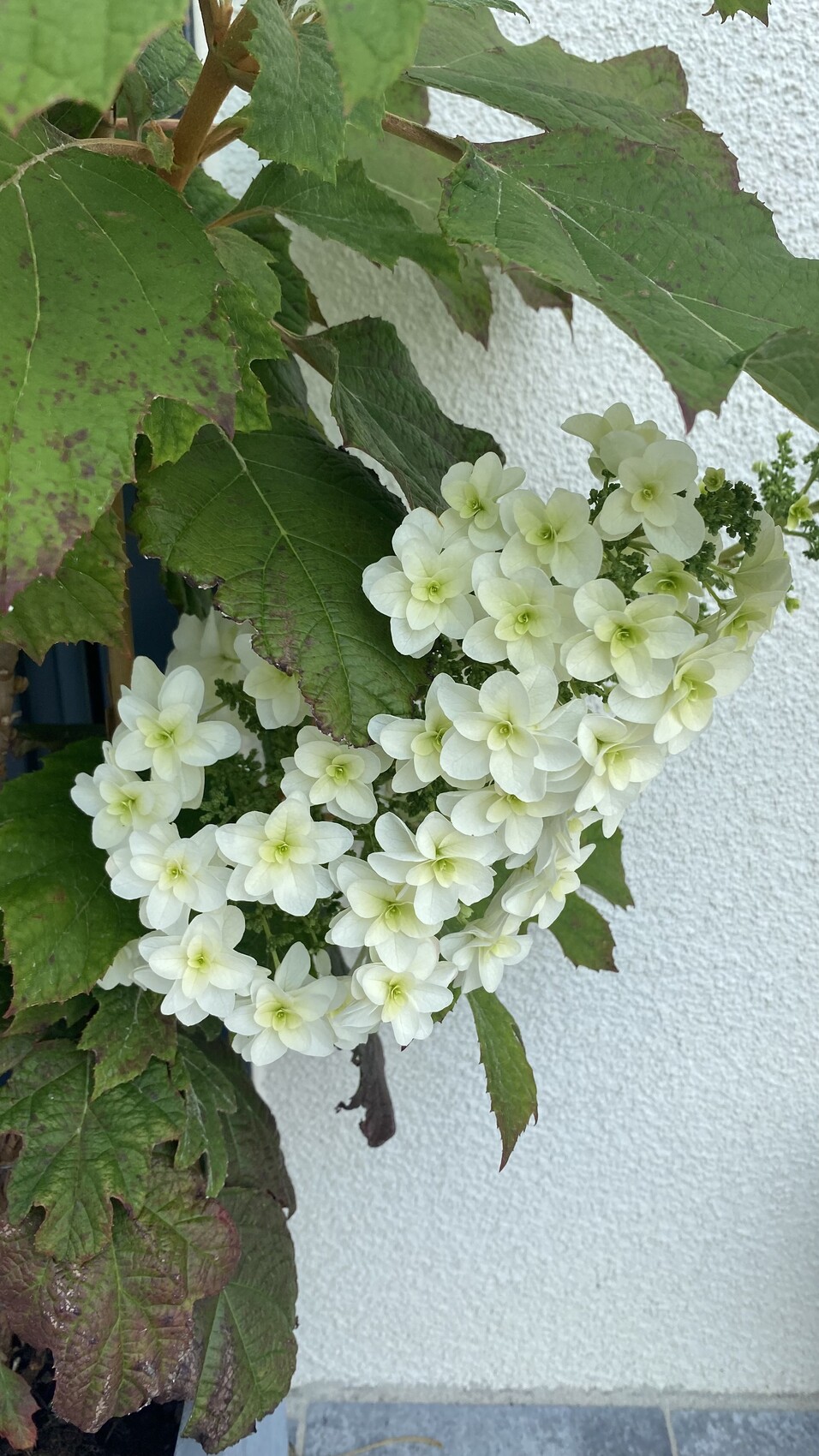 Weiße Hortensienblüten in dichter Blütentraube mit grünen Blättern vor einer weißen Wand