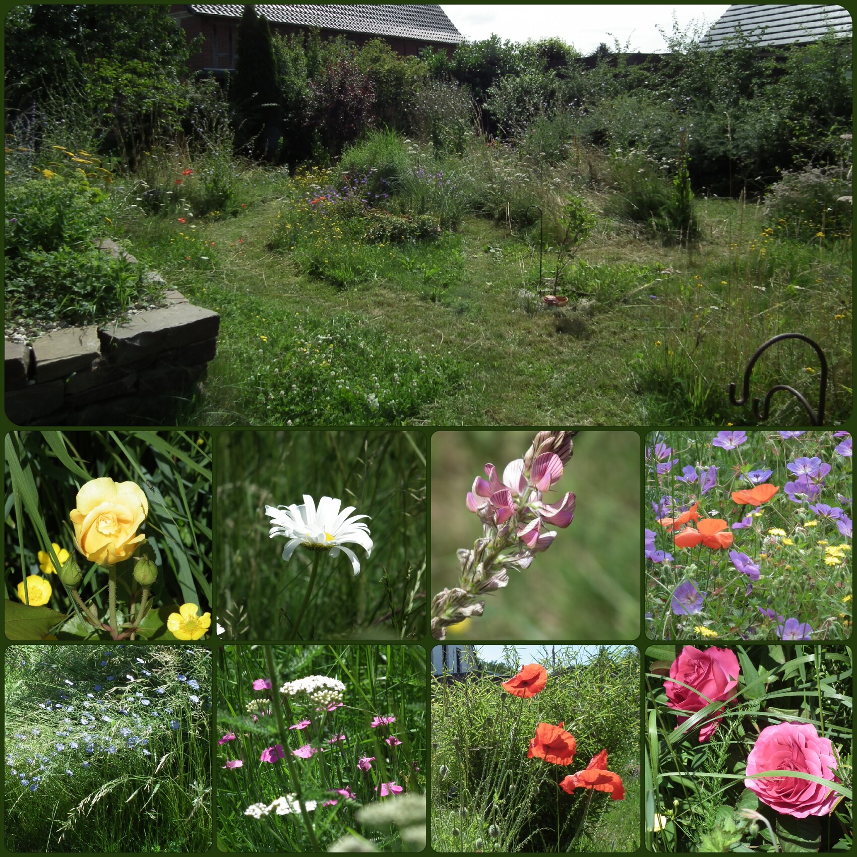 Wiese unten im Juli nach dem Mähen der Wege. Ich muss dringend den Rest sensen, und nächstes Jahr eher schneiden, damit sich die Artenvielfalt wieder etwas erhöht, die war dies Jahr nicht so gut wie letztes.