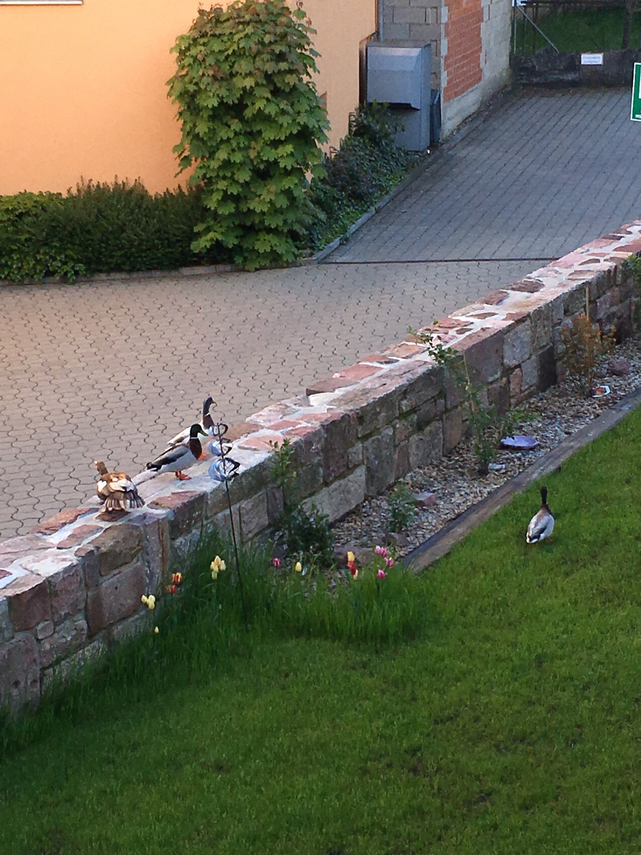 Drei Enten sitzen auf einer Steinmauer neben einem Garten mit Tulpen und gepflastertem Weg.