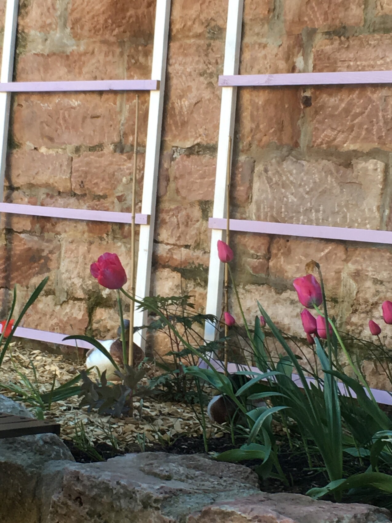 Pinkfarbene Tulpen im Garten vor einer Steinmauer mit lilafarbenen Streben.