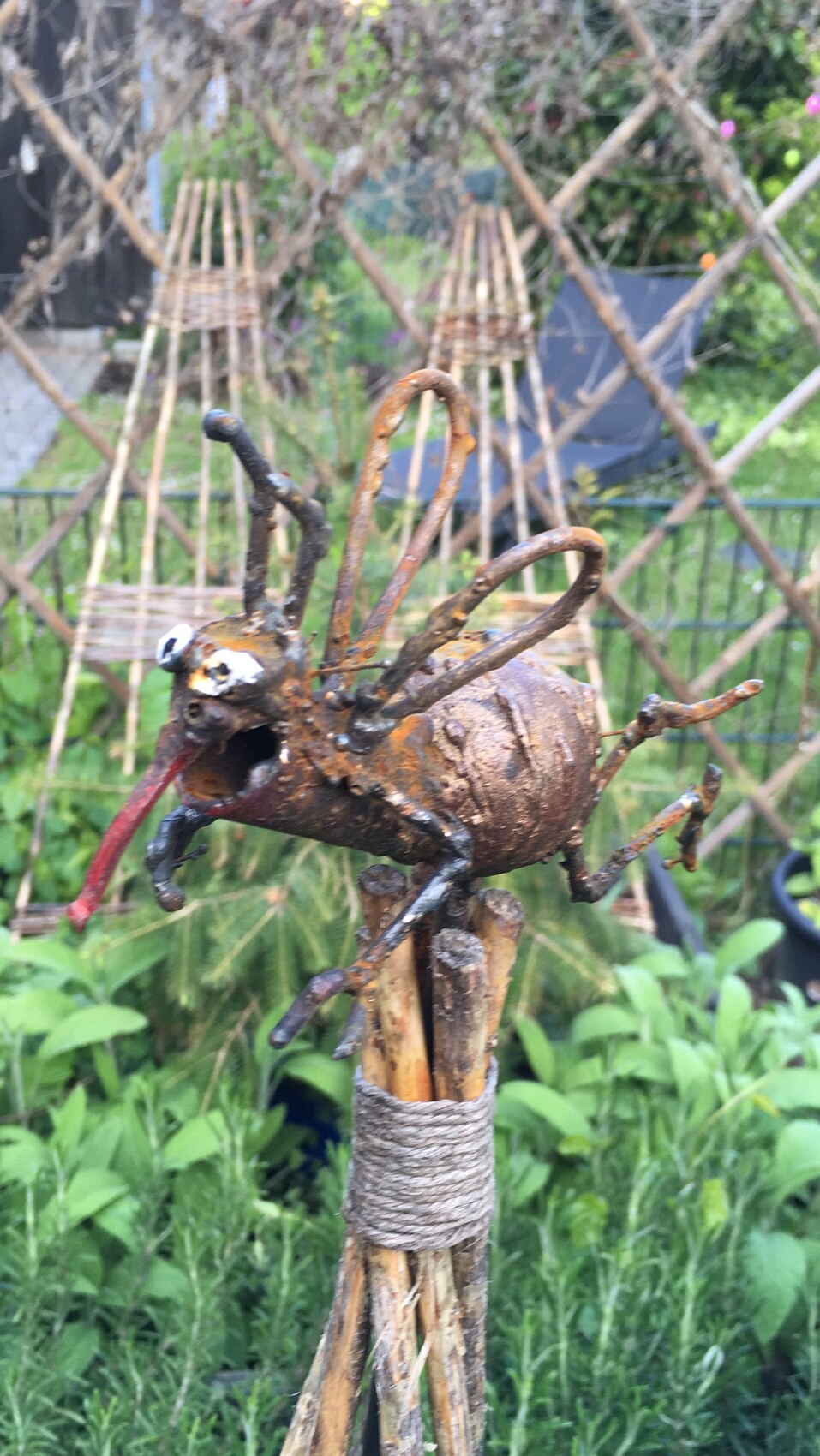 Rostige Metallskulptur eines tierähnlichen Wesens mit roter Zunge, auf Stäben gebunden, im Garten.