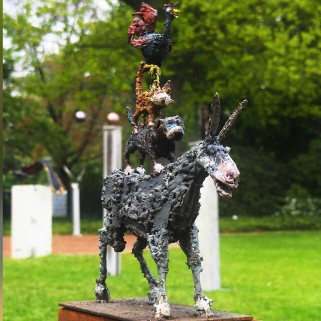Rostige Metall-Skulptur eines Esels mit mehreren Figuren auf dem Rücken im Park.