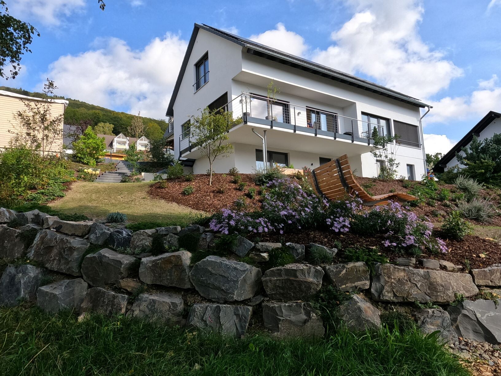 Neben der wirklich nicht anspruchslosen Geländemodellierung (wir haben 8m Höhenunterschied auf dem Grundstück) und den möglichst minimal ausgeführten Stützelementen, haben wir ca 850 Pflanzen gesetzt. Ausserdem ca 18 Kubikmeter Rindenmulch und Holzhäcksel die wir brauchen um die Erosion der Böschungen zu verhindern. Grundsätzlich soll das alles überwuchert werden und verrotten, aber das braucht etwas Zeit.