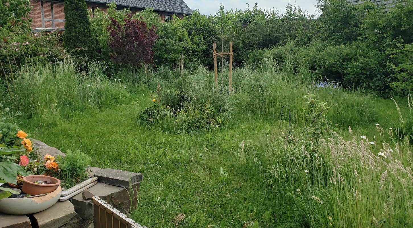 Die Wiese wird spätestens Pfingsten zur Hälfte gesenst, leider kaum mehr Blühpflanzen, dafür viele neue Grassorten. Hat aktuell, da die Spieren und der Weißdorn in der Hecke nicht mehr blühen, etwas von einer grünen Wand 😉 aber ich bin zuversichtlich, dass es nächstes Jahr wieder anders aussehen wird.