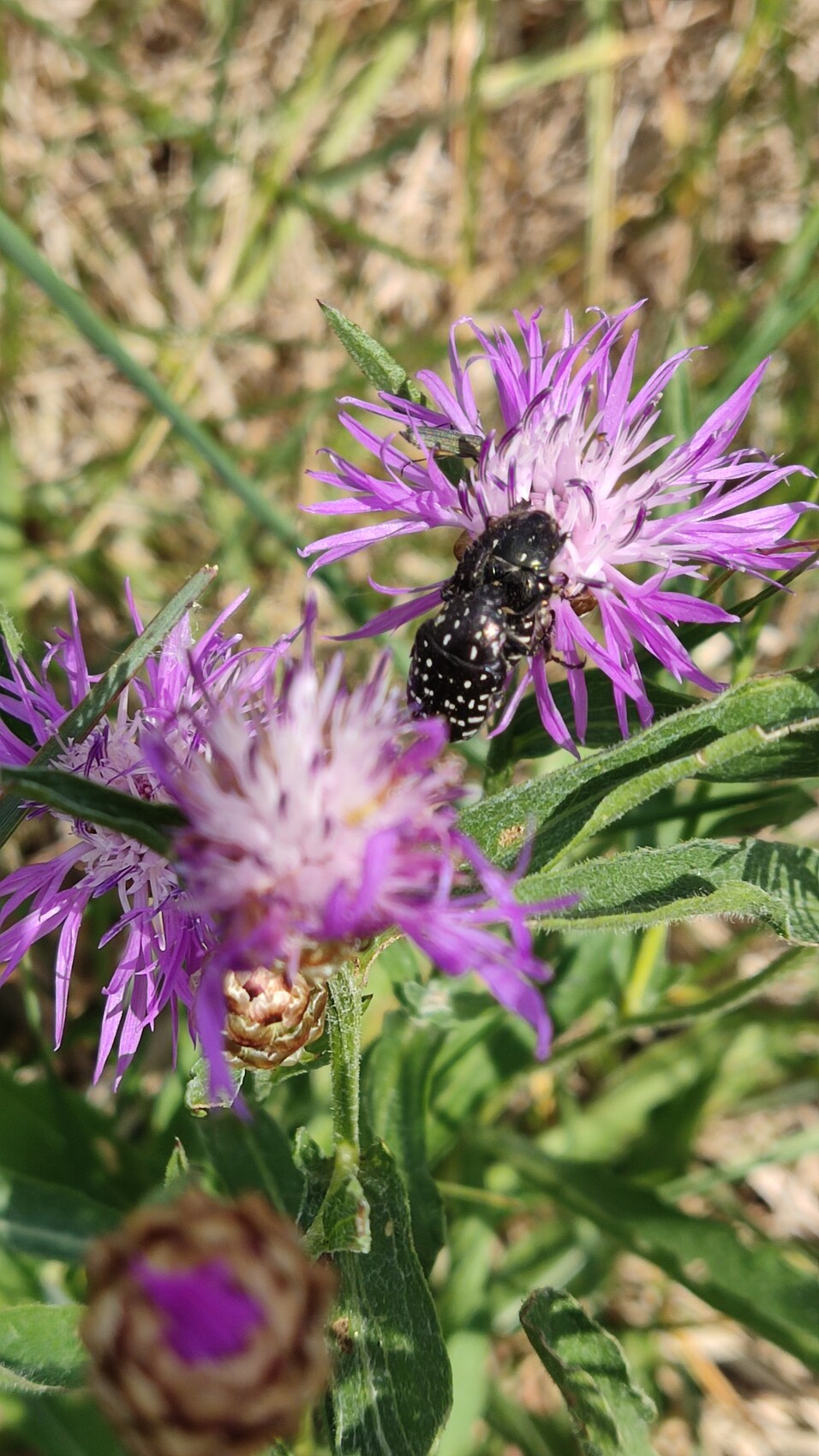 Schwarzer, gepunkteter Käfer sitzt auf einer violetten Blüte in einer Graslandschaft.