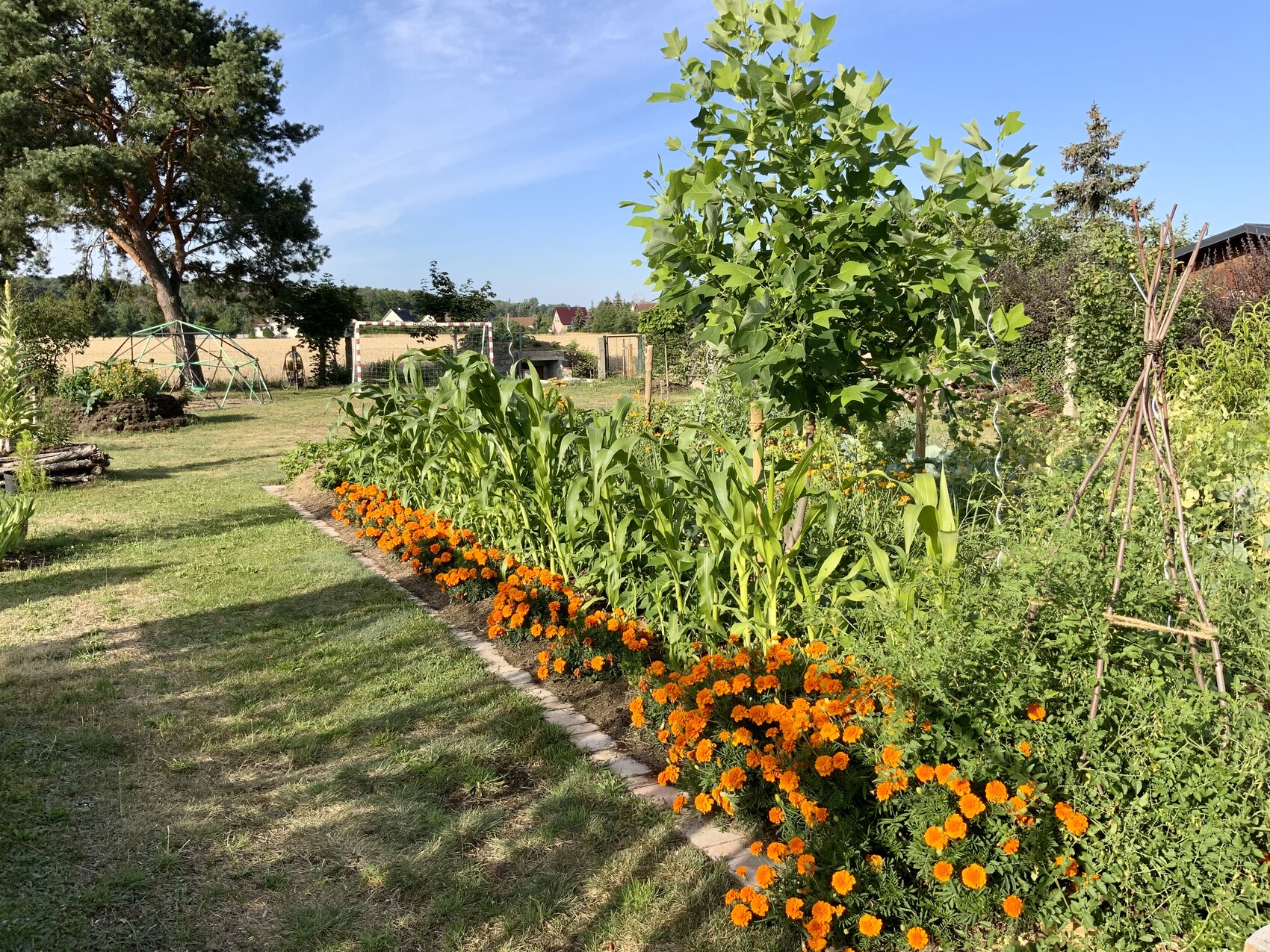 Heute 1,5 kg Johannisbeeren geerntet und gleich Sirup draus gekocht, yammi! Ich lasse die Johannisbeeren so lange, wie nur möglich am Strauch.. dann werden sie richtig schön süß. Das Gräserartige im Gemüsebeet ist Erdmandel.. daraus macht man in den südlichen Ländern Horchata. Wächst hier prima.. man muss aber wohl aufpassen.. sie breitet sich gern aus. Ist mein erster Versuch. Die Tagetes zur Beetbegrenzung sind alle selbst gezogen und die Gurke darf auf den Apfelbaum klettern..