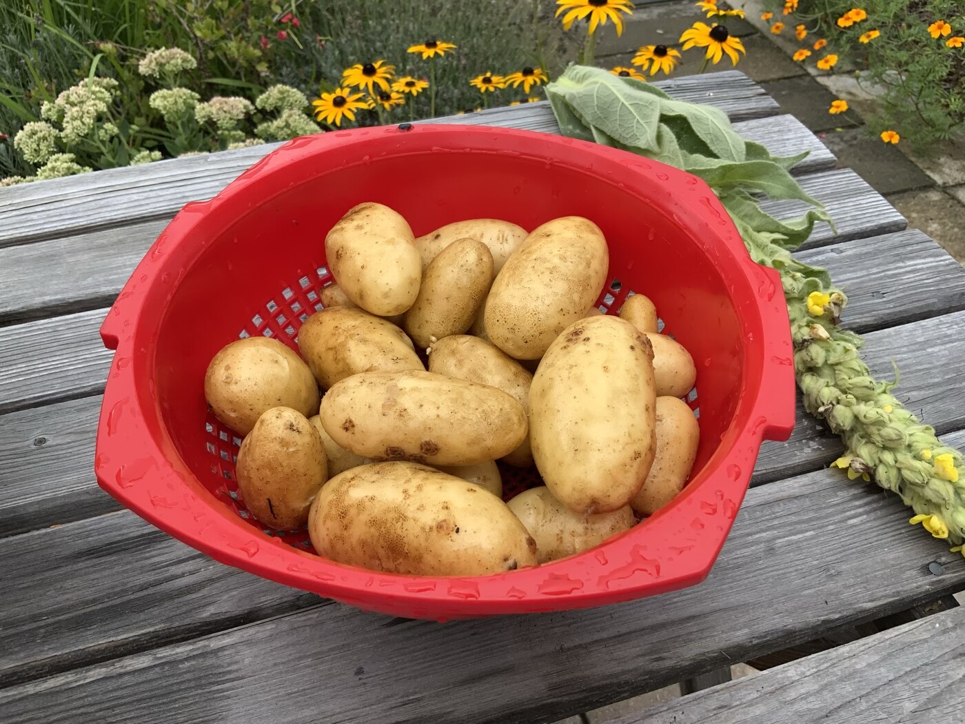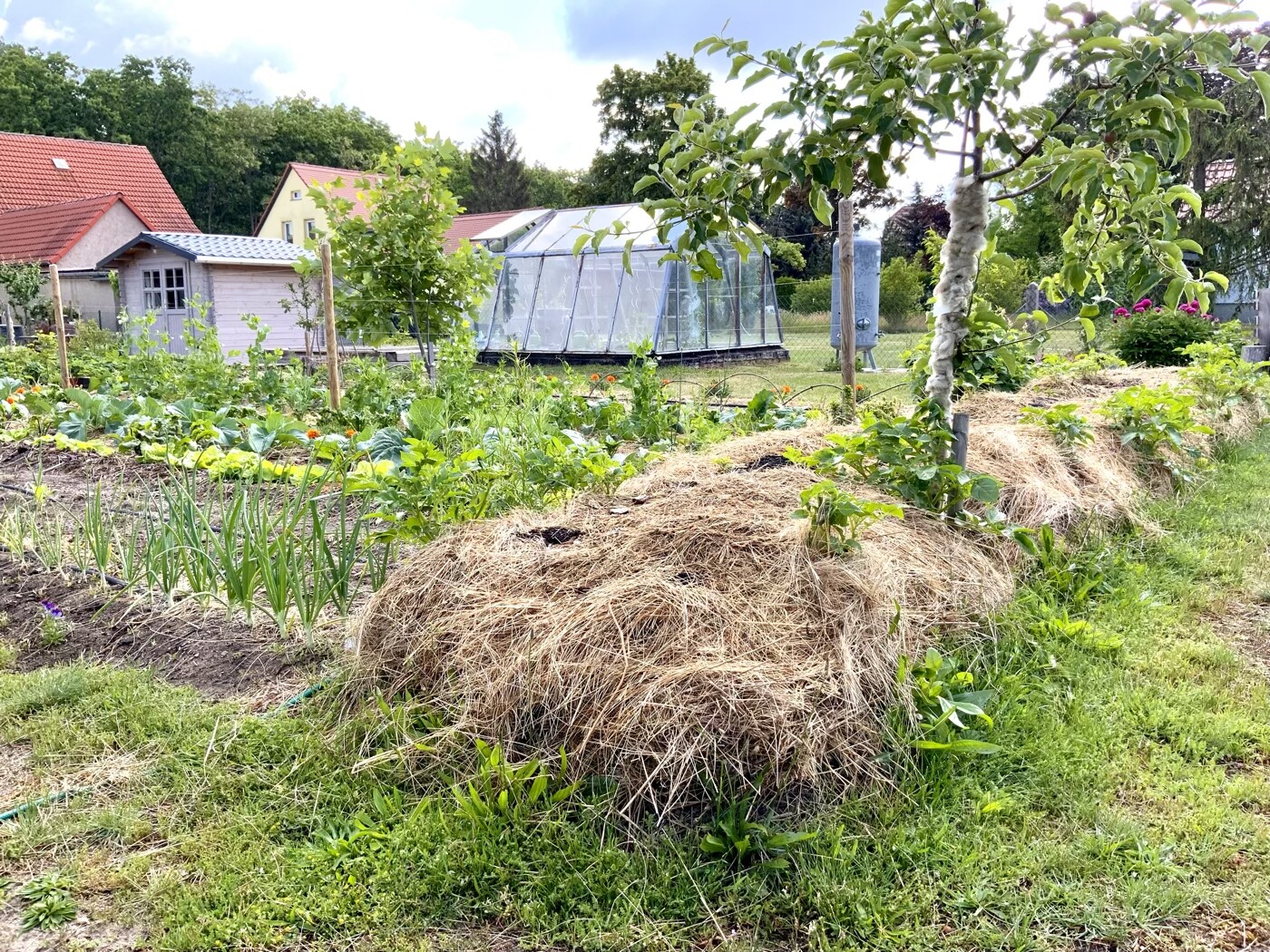 Der erste Versuch ist gelungen. Heute habe ich wieder von einer Pflanze 1,2 kg schönste Kartoffeln aus dem Heu geholt.. Sorte „Anabelle“