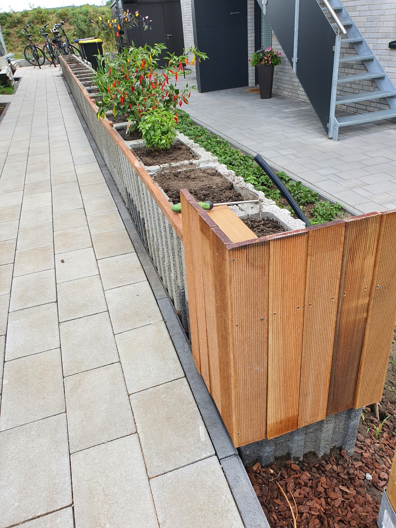 Dank Zwangsurlaub (Quarantäne) konnte ich mich nach einigen Schittagen draußen austoben. Nicht zu sehen, rechts neben den Pflanztrögen habe ich noch knapp 30cm bis zur Grenze die ich nutzen werde um mit Pfählen eine Art Spundwand zu bauen und an die Pflanztröge "andocke" zur Verbreiterung des Hochbeetes auf dann ca. 65cm bei fast 13m Länge.Ist recht ähnlich dem was ich noch vor mir habe auf 17m Länge.