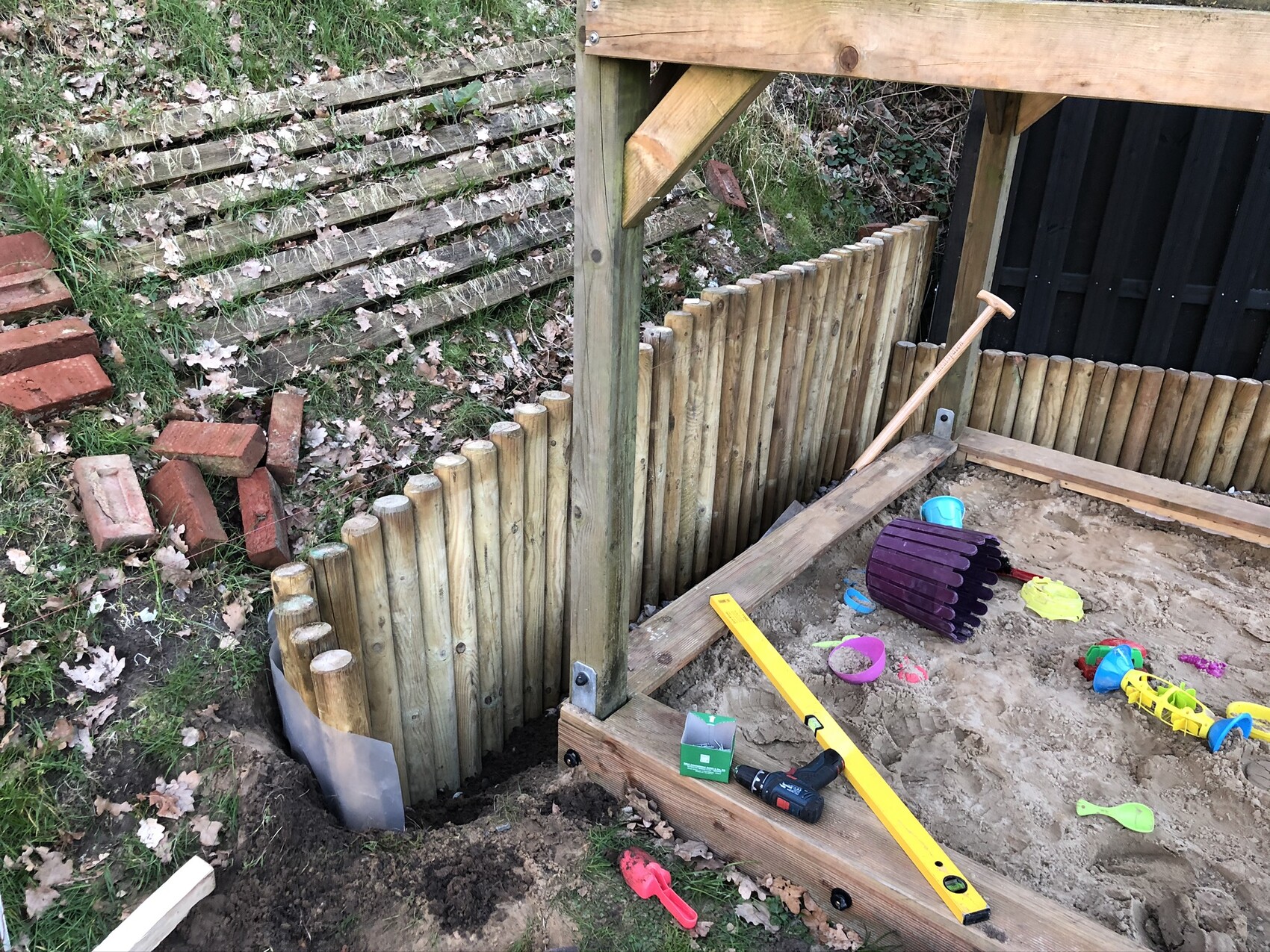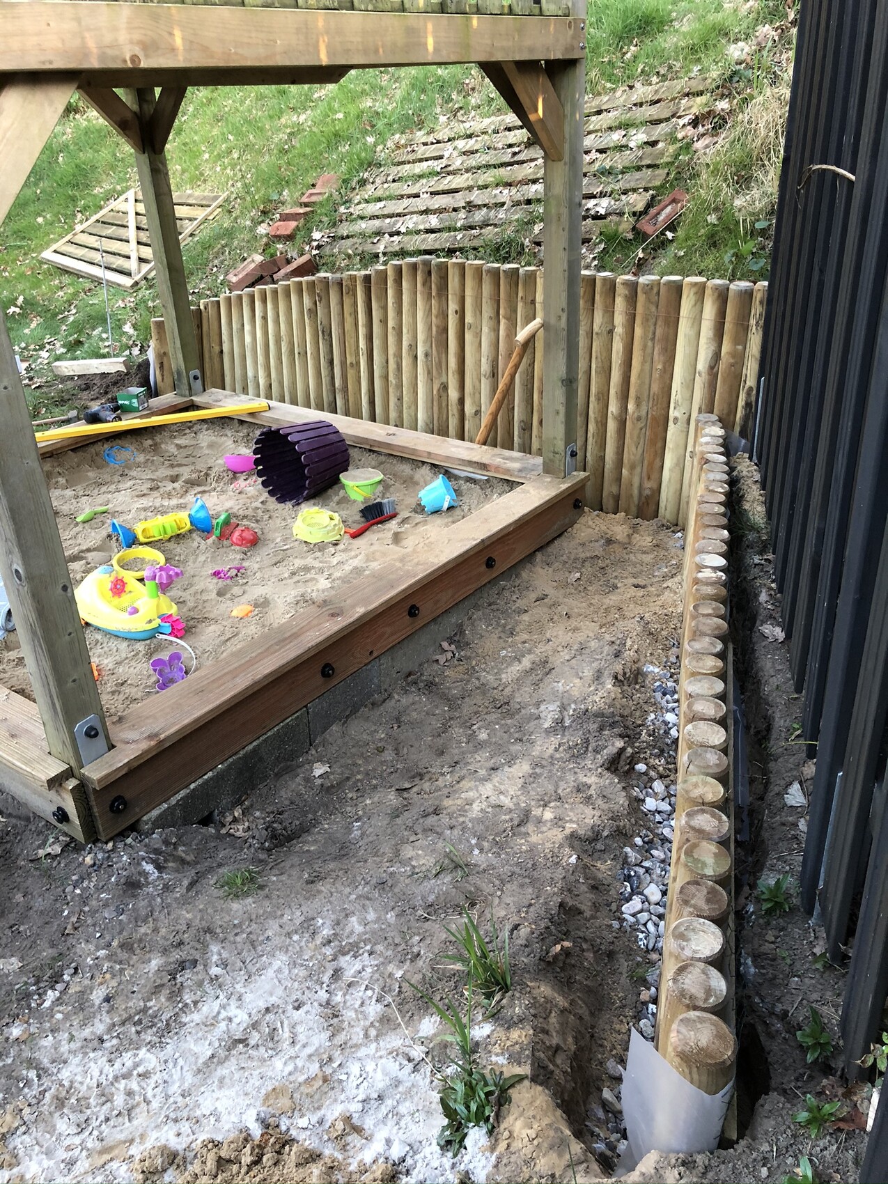 Dann habe ich die Ecke, wo der Spielturm steht noch mit Holzpalisaden eingefasst, da dort unser Hang anfängt und es so etwas aufgeräumter wirkt.