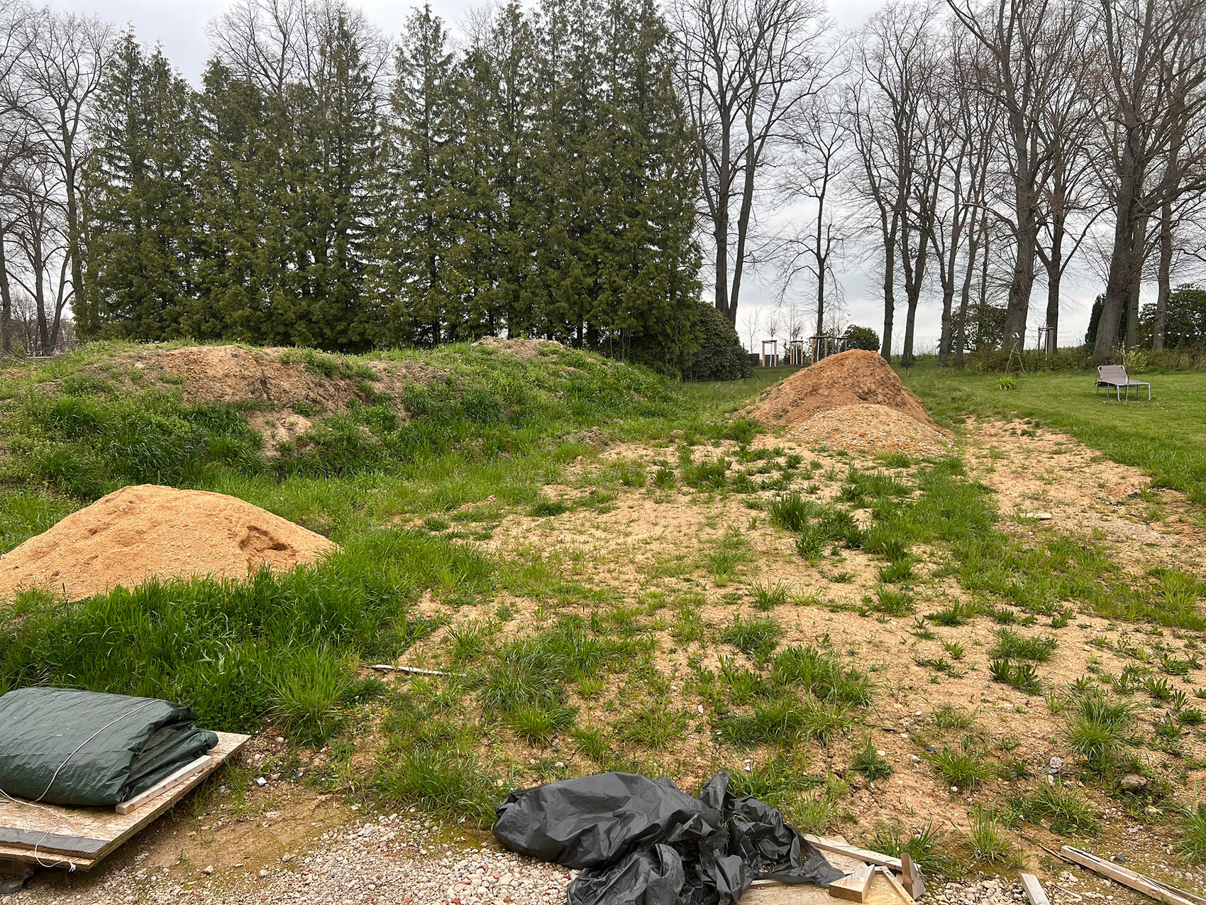 Den vorhandenen Aushub würde ich gern erstmal verteilen, und möglichst eine ebene Fläche, insbesondere zum Haus hin schaffen - was nicht verteilt werden kann, muss dann vor das Haus wandern, um den Vorgarten dort zu gestalten.