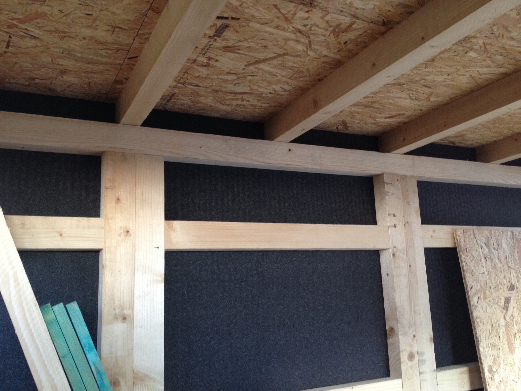 Dach und Tür sind Rauspund, Dachlatten 80x60mm. Aufs Dach kamen an den Rand noch kleine Latten um da dann die Folie rüber ziehen zu können und die Abschlussleisten darauf zu machen. Die Folie wird aus einem Stück geschnitten und dann geklebt. Geht relativ schnell, beim zweiten Mal wahrscheinlich noch schöner, aber sehen tut man es eh nicht.