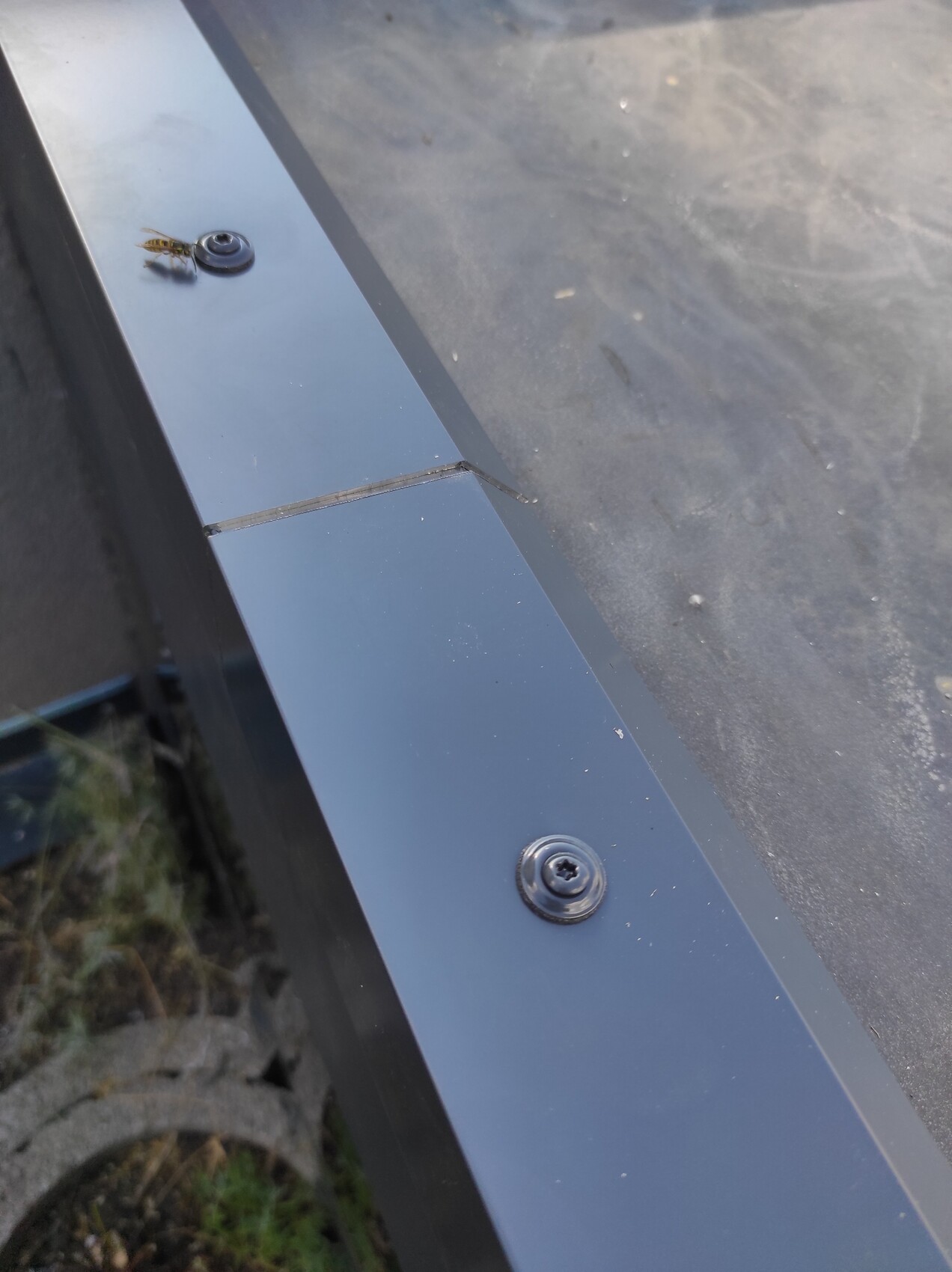 Nahaufnahme eines blauen Metallrahmens mit Schrauben; eine Wespe sitzt auf der Kante.