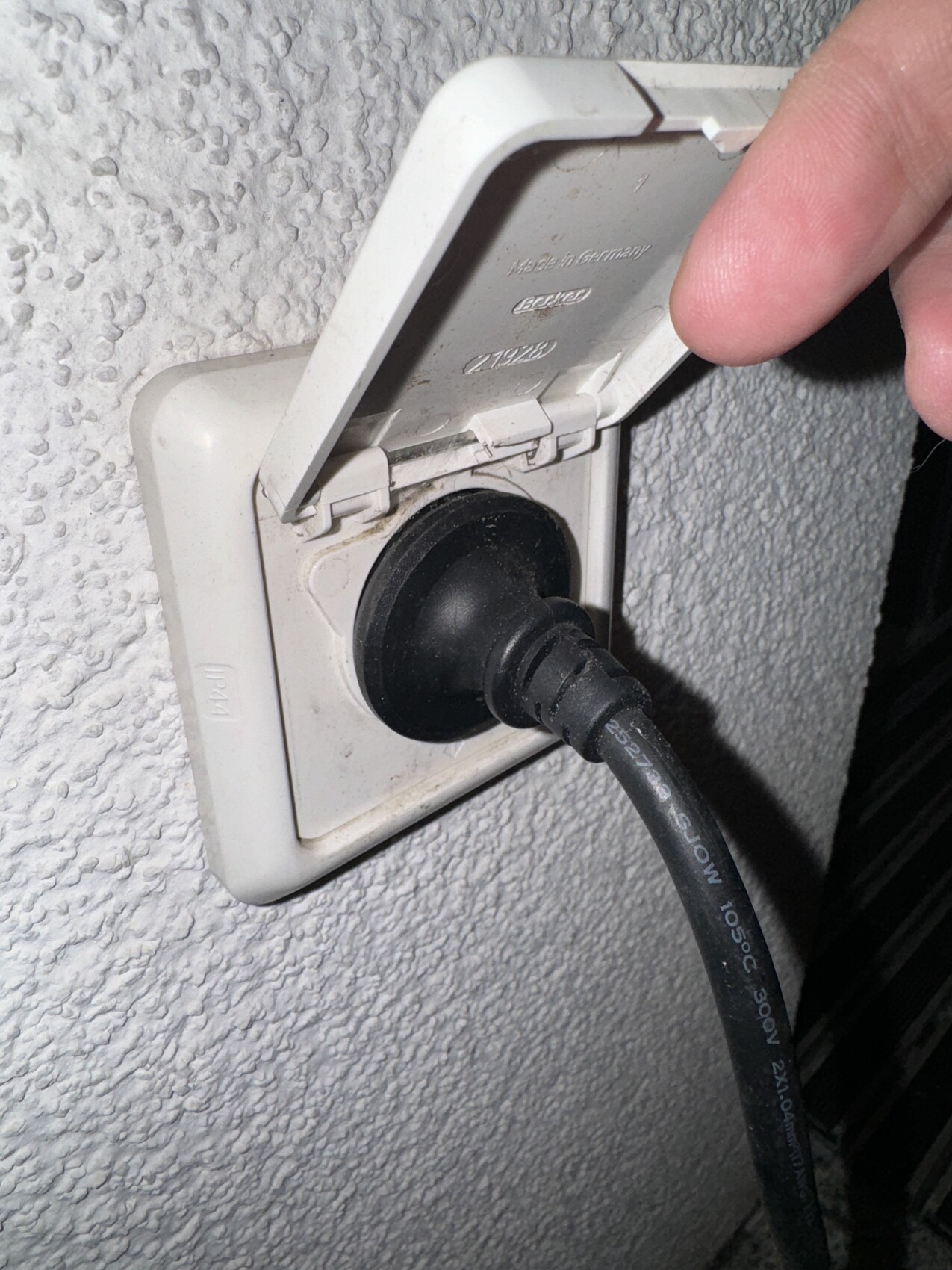 Das hier ist der Stecker des Hue IP67-Netzteils in einer IP44-Steckdose. Das dichtet garnix ab, was über leichen Nieselregen hinaus geht: