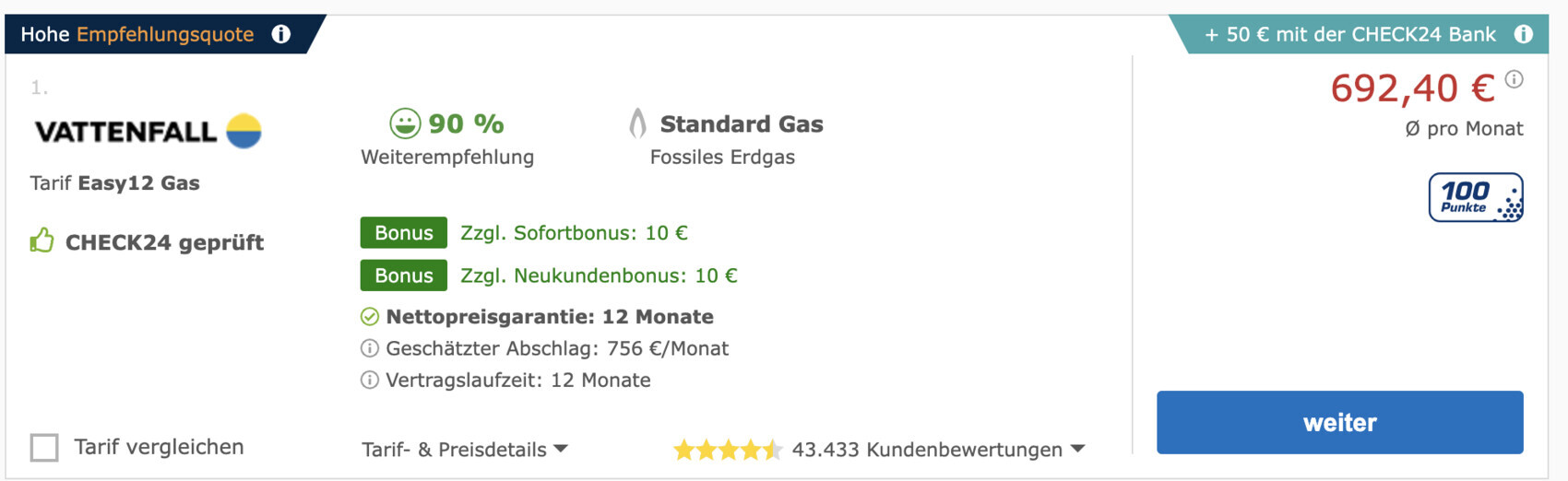 Naja. Momentan haben die Versorger mit Ihrem Geld besseres anzustellen, als Vermittlungsgebühren an die Drücker-Portale abzudrücken. Am besten Mal direkt bei den lokalen Versorgern oder direkt bei den ganz großen (gelb, blau, rot...) anfragen. Idr gibt's da schon noch Neu-Tarife, deutlich günstiger als bei den Portalen. (Vor 4 Wochen: direkt beim StromVersorger 34 Ct./kwh vs. ~45 Ct. beim Portal.Meine Stadtwerke machen Neuverträge derzeit nur noch mit Haushalten, die sich im Stadtgebiet befinden. 25,26 Cent/kWh. Bei Vericheck24 schon locker über 40 Cent für meine PLZ.