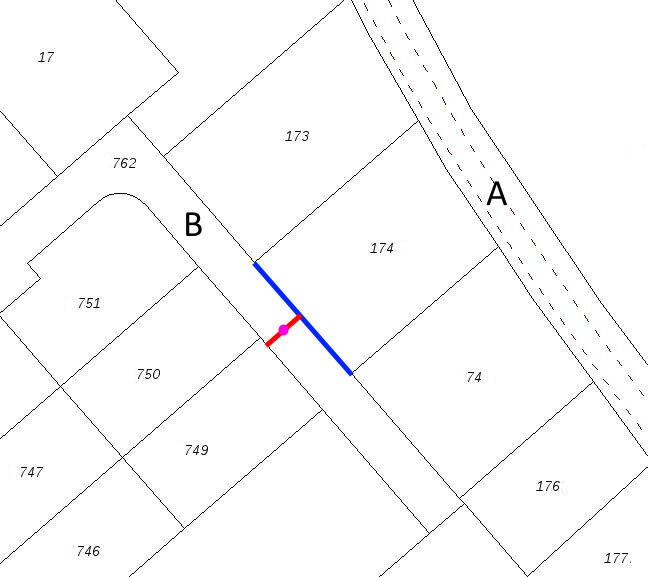 wie genau ich "A" und "B" ermittleDu musst nicht "A" und "B"ermitteln. Entweder liegt dein Grundstück an Planstraße "A" oder an Planstraße "B". Anders als bei Dir liegt in meinem Beispiel das Baugrundstück an zwei Straßen, so dass der Bebauungsplan eindeutig bestimmen müsste, welche Straße heranzuziehen wäre. Hier mal "B" angenommen . Dann wird der Mittelpunkt der straßenseitigen Grenze (blau) bestimmt, an dieser Stelle dann der Mittelpunkt der Straße (rot). Die Höhe des Magenta-farbenen Punktes ist dann die Bezugshöhe. Während für Flurstück 174 die Mitte eindeutig zu ermitteln ist, ist das bei Flurstück 751 schon nicht mehr möglich, daher meine Kritik bezüglich Bestimmtheit des Traufbezugspunktes.Marcello schrieb: