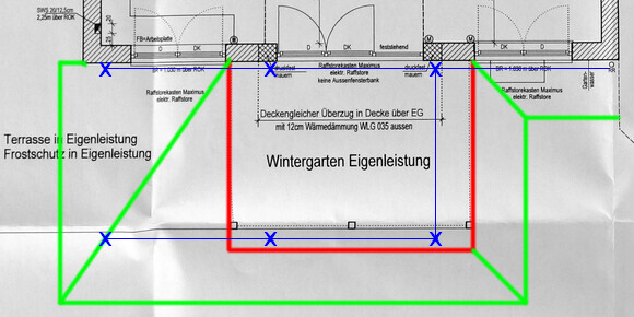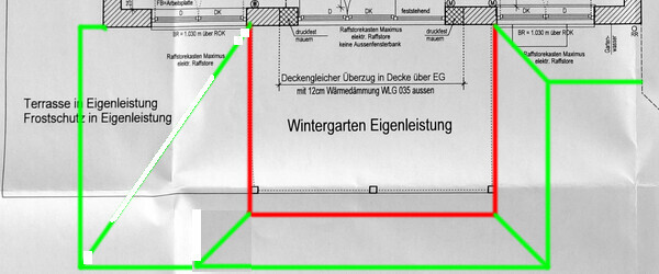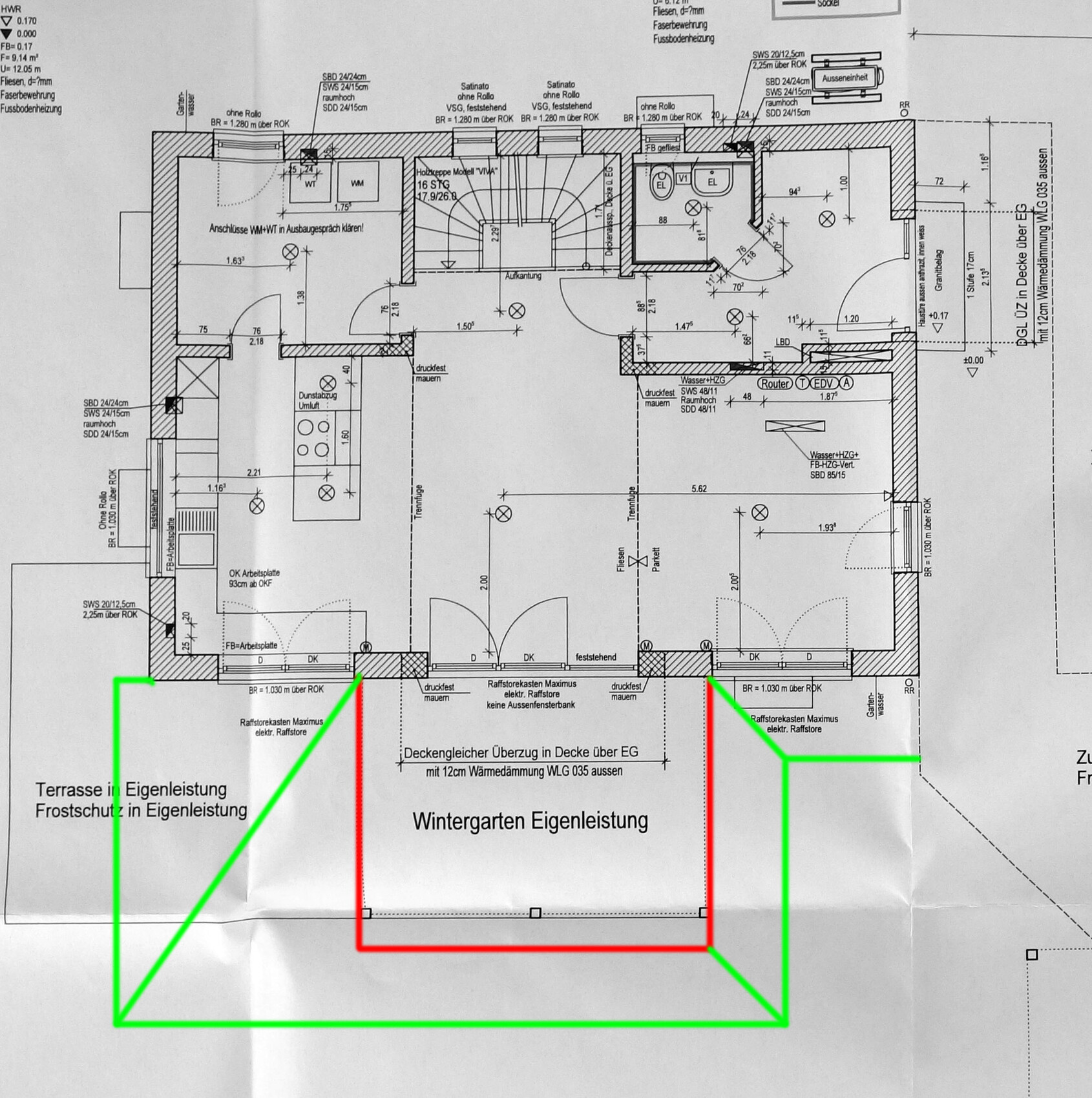 Die grüne Linie soll der Terrassenumriß sein, die rote der Wintergarten mit Dachüberstand, das eingezeichnete Fenster soll die Schiebetür darstellen (warum nicht seitlich zum Terrassen-Essplatz vor der Küche hin) ?