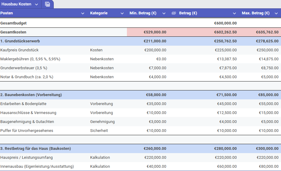 Gesamtbudget: 600.000 € Gesamtkosten (Plan): 602.262 € (Spanne: 529.000 € bis 635.762 €)