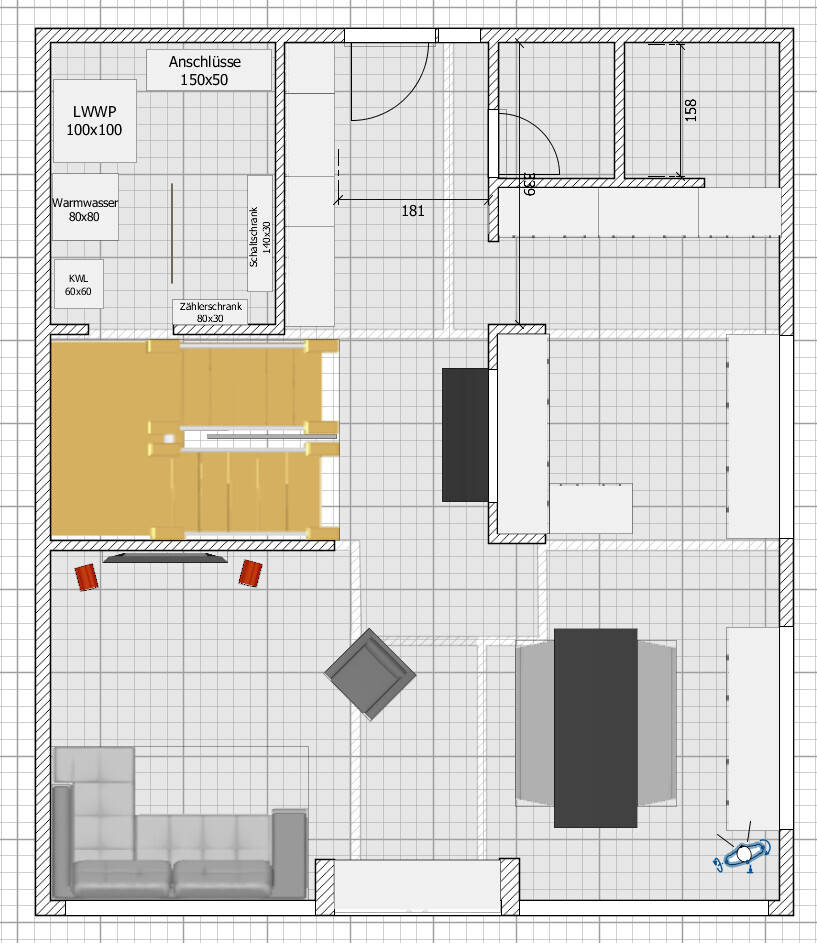 So, was sehen wir hier... Wir haben die Wand hinter dem Fernseher verlängert, damit der Blick vom sofa nicht zur Haustür und umgekehrt möglich ist. Das kleine Stück öffnet zwar den Raum, aber wir nehmen uns zu Herzen, dass man da dann nicht ganz so entspannt sitzt. Damit es nicht so ein Schlauch wird, haben wir die "[-Wand" in der Küche etwas nach innen geschoben, sodass man hier auch mal ein Aquarium o.ä. hinstellen kann. Vorher wäre nur Bilder an der Wand möglich.