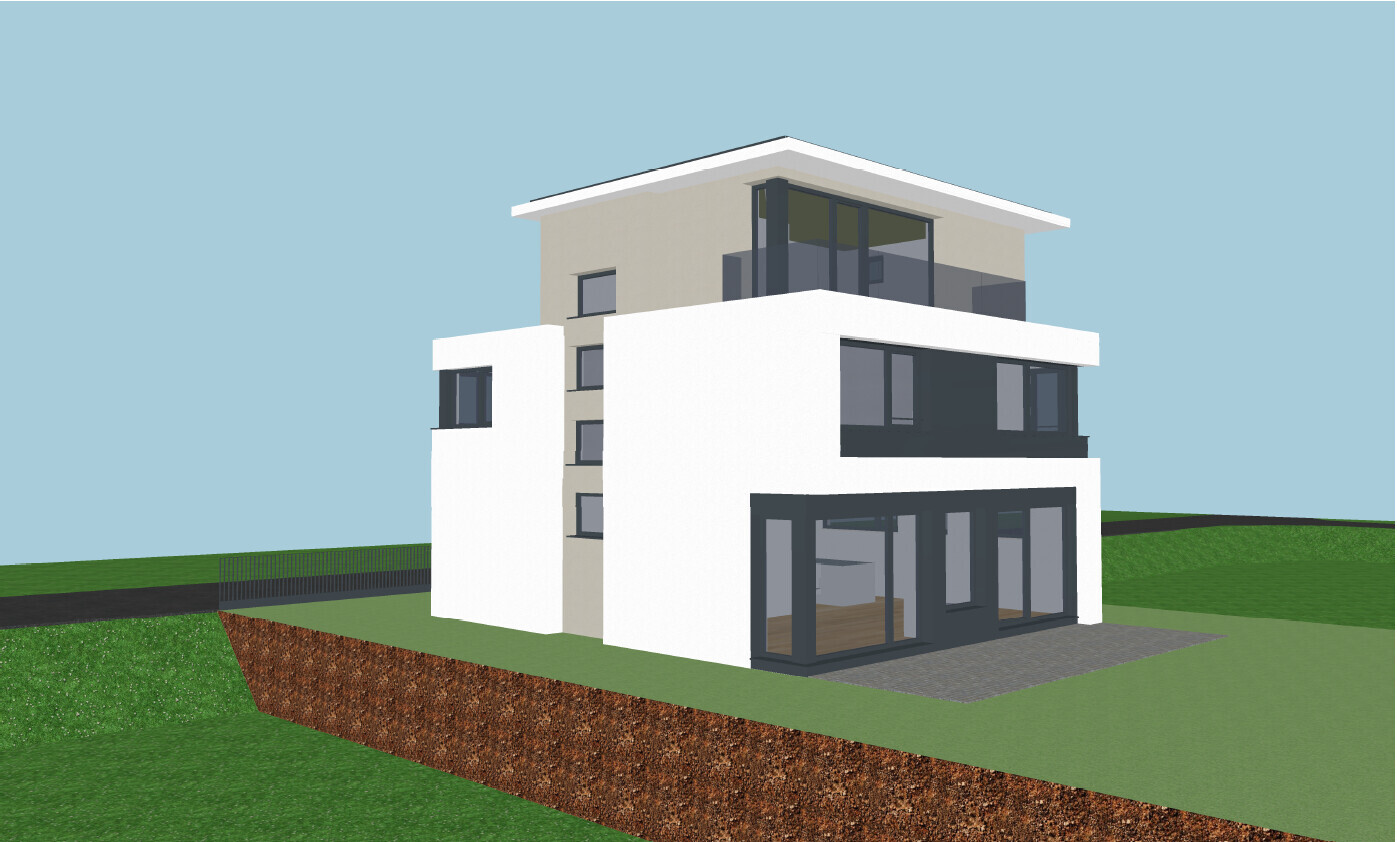 Anbei die S-Form mit 75cm Brüstungshöhe. An den Grafiken ist die Lage des Hauses auf dem Grundstück zu erkennen.Wie wäre es, wenn Du mal das Grundstück, also den Lageplan hier einbringst? Bis jetzt sieht man ja nur verzerrte 3D-Zeichnungen....