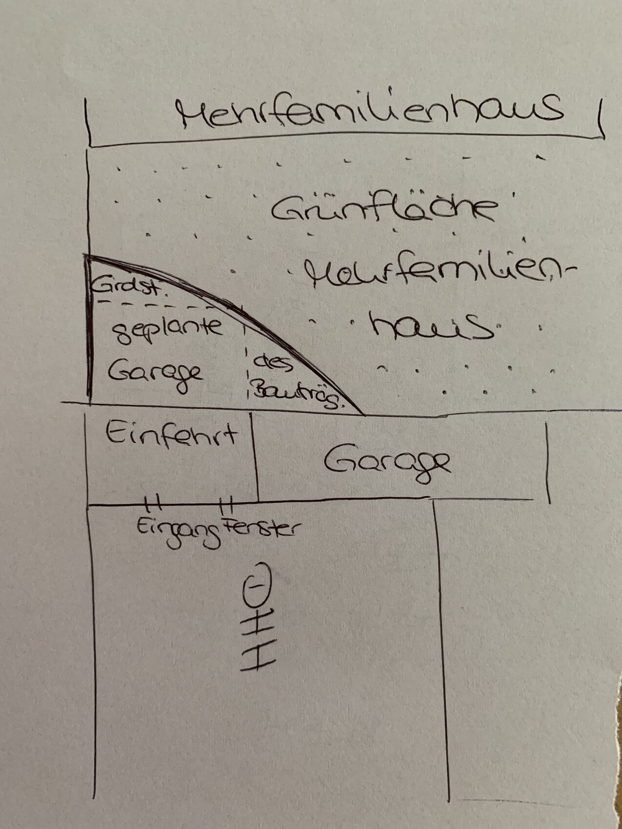 es hat sich ein Problem ergeben, welches uns einige Bauchschmerzen bereitet. Wir wohnen seit 2013 in einer Doppelhaushälfte. Gebaut haben wir mit einem in NRW namhaften Bauträger. Auf unserem Grundstück steht direkt an der Hauswand eine 9m Garage, vor der Garage haben wir eine ca. 5-6m lange Fläche mit Zugang zum Hauseingang und zur Garage (zum Grundstück gehörende Einfahrt). Unsere Einfahrt grenzt „vor Kopf“ an städtisches Grundstück. Neben unserer Einfahrt besitzt unser alter Bauträger noch eine kleine Grundstücksfläche, daneben wiederum grenzt fremdes Grundstück an, wo inzwischen ein Mehrfamilienhaus mit Gartenfläche steht. Verlassen wir das Haus, schauen wir also aktuell auf den Garten des Mehrfamilienhauses und das kleine freue Grundstück.