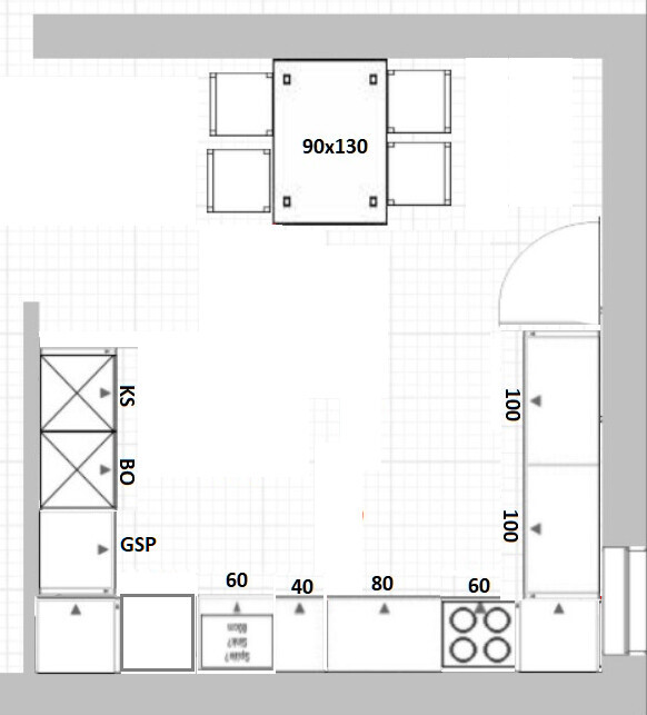 > "Ich würde die Wand zum WC mit den Hochschränken voll besetzen. Dann ist die Küchenzeile schon sehr viel entspannter in der Anordnung."