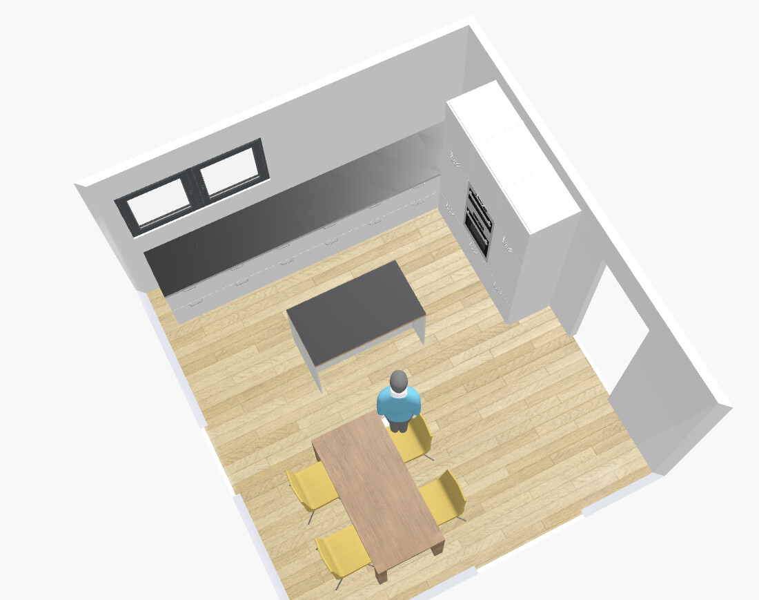 Allerdings würde ich die Anschlagsseite der Terrassentür ändern. Insel habe ich auf 140 x 80 gesetzt, persönlich würde ich aber auch auf 160er Breite gehen. Esstisch ist 165 x 80… auch nicht prall, aber nutzt ja nix. Raum gibt nicht mehr her. Ich könnte mir noch einen runden Tisch vorstellen.