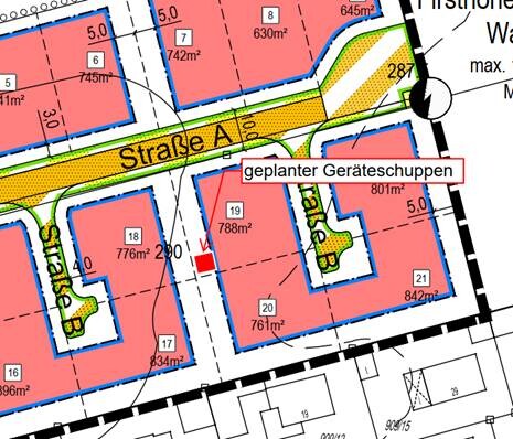 Lageplan: Grundstücke, Straße A, rote Bauflächen und geplanter Geräteschuppen.
