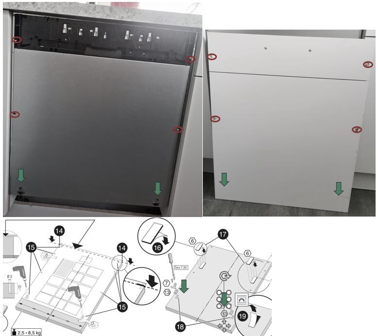 Was mich ziemlich ärgert: Ich habe mir jetzt mal die Montageanleitung vom SMV46KX03E/28 im Internet angeschaut (siehe Anhang). Dort ist klar unter Nr. 15 zu erkennen, dass 6 Schrauben (bei mir fehlen die oberen) und zudem ganz unten zwei Frontbefestigungshaken hätten montiert werden müssen (siehe grüne Pfeile). Für mich ist es also schon kein Wunder, dass da was abgebrochen ist.