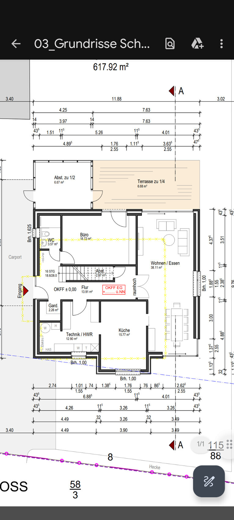 Kurzer Einwurf am Rande, ich persönlich finde die Küche zu klein und würde den Esstisch da herausnehmen, um die Küche dafür zu vergrößern. Ich verstehe euren Wunsch dort einen ungezwungenen Essplatz zu haben, aber ohne Keller habt ihr nur Hauswirtschaftsraum und Abstellkammer als Stauraum. Einen Hauswirtschaftsraum eurer Größe haben wir auch und den haben wir zu zweit voll bekommen.
