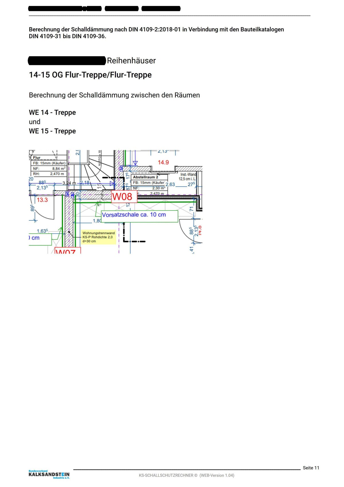1) Es scheint für mich so zu sein, dass an der Wand zwischen unserem Wohn-Essbereich und dem Wohn-Essbereich + Flur/Treppe ausschließlich die Trennwand zwischen den beiden Wohnbereichen betrachtet wird und der Treppenbereich vollkommen außer Acht gelassen wird (ersten beiden jpg vom Gutachten). Nach meiner Einschätzung geht doch von der Trennwand zwischen dem Flur-/Treppenbereich des Mittelhauses zu unserer Wohnküche ein deutlich größeres Schallrisiko aus. Die Fläche des Trennbauteils ist auch mit 12,12 m² angegeben, die Vorsatzschale und die Trennwand zum Nachbarn sind aber 14,86 m² (Habe noch einen Ausschnitt angehängt).