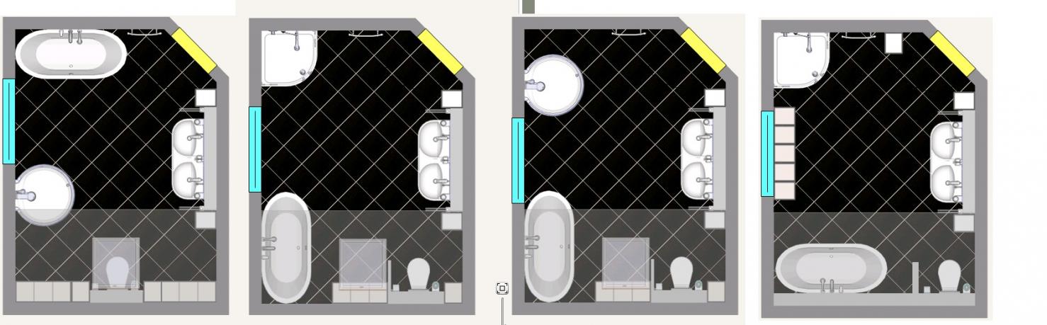 Die freistehende Wanne würde sich ja gut an der kurze Wand hinter der Tür gut machen, jedoch müsste dann die Dusche neben dem Fenster bis vor die Schräge mit 3seitiger Verglasung was sicherlich auch schick aussehen würde und was neues wäre mal nicht in einer dichtgemauerten Ecke zu stehen, durch das Glas kommt dann ja auch genug Licht zu den Spiegeln vom Waschbecken.
