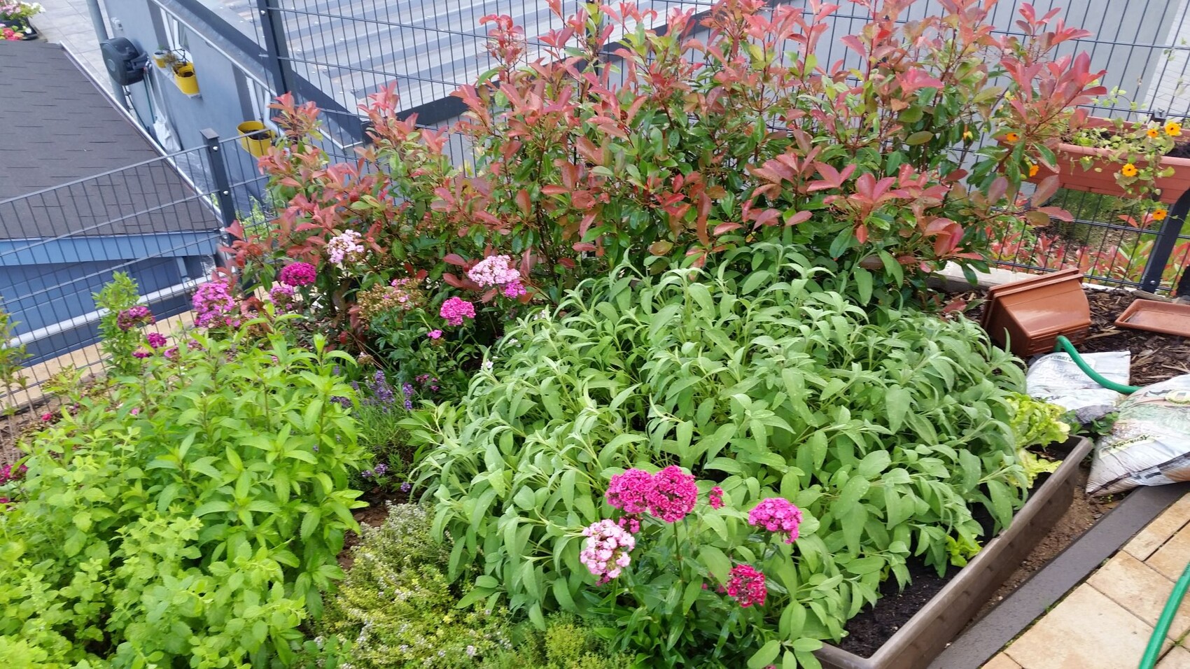 Die anderen Kräuter (Thymian, Zitronenthymian, Minze, Japanische Minze, Zitronenmelisse, Majoran, Oregano und Rosmarin) haben wir wenigstens im Topf in der Erde platziert - sonst wuchern die ohne Ende.