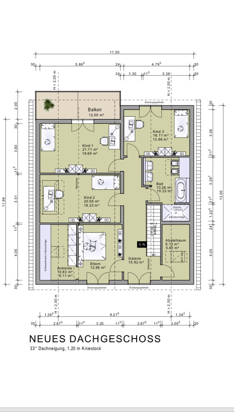 Was gefällt nicht? Warum?: “Schlauchzimmer”im OG. Der Raum ist im Prinzip zu viel. Geplant sind 2 Kinder. Der erste Entwurf (anhängend) ließ Platz für ein gleich großes drittes Kinderzimmer was alternativ als Spielzimmer hätte genutzt werden können (um Lego-Burgen oder Karrerabahn auch mal stehen lassen zu können). Nachdem die Treppe umgeplant wurde ergab sich im OG zwangsläufig eine andere Raumaufteilung. In diesem Zug wollten wir das Badezimmer lieber in Richtung Garten verlegen um dort ein normales Fenster und nicht nur Dachfenster zu haben. Zudem haben wir das Schlafzimmer ebenfalls zum Garten hin verlegen lassen. Laut unserer Architektin lässt sich wegen der Auflage der Mittelfetten nur so realisieren wenn wir das mit diesem “Schlauchzimmer” zwischen Kinderzimmer und Schlafzimmer planen. Nun fiel uns auf, dass die Ankleide recht schmal ist und man quasi direkt im Bett steht wenn man die Tür öffnet. Im Ankleide haben wir Planlinks einen Kniestock von 1,20m und 1,34m weiter rechts eine Höhe von 2m. Wir können also auf 4,50m eine Kommode in Höhe von 1,20 stellen. Zur Bettseite hin müssten wir dann Schrank und Spiegel stellen und hätten zwischen den Schränken nur 1,30m. Wieso aber, wenn man quasi dieses Nutzlose Zimmer direkt daneben hat? Habt ihr eine sinnvolle Idee, dieses Schlauchzimmer als Ankleidezimmer zu integrieren? Bett zieht mit um weil neu und hat eine Kopfhöhe von 1,20m könnte man also grade so in die Schräge schieben ♂️