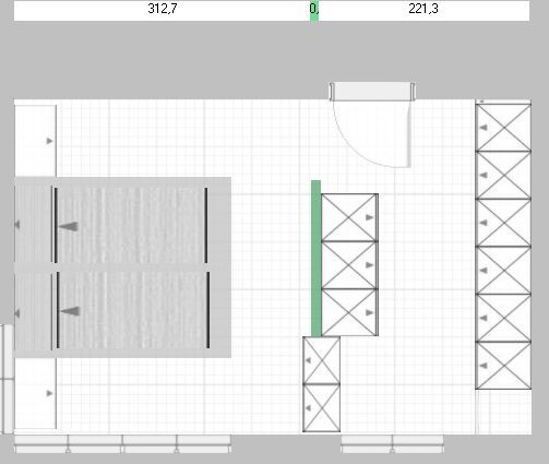 Die Tür würde ich auch mittig zwischen die Schrankreihen setzen.