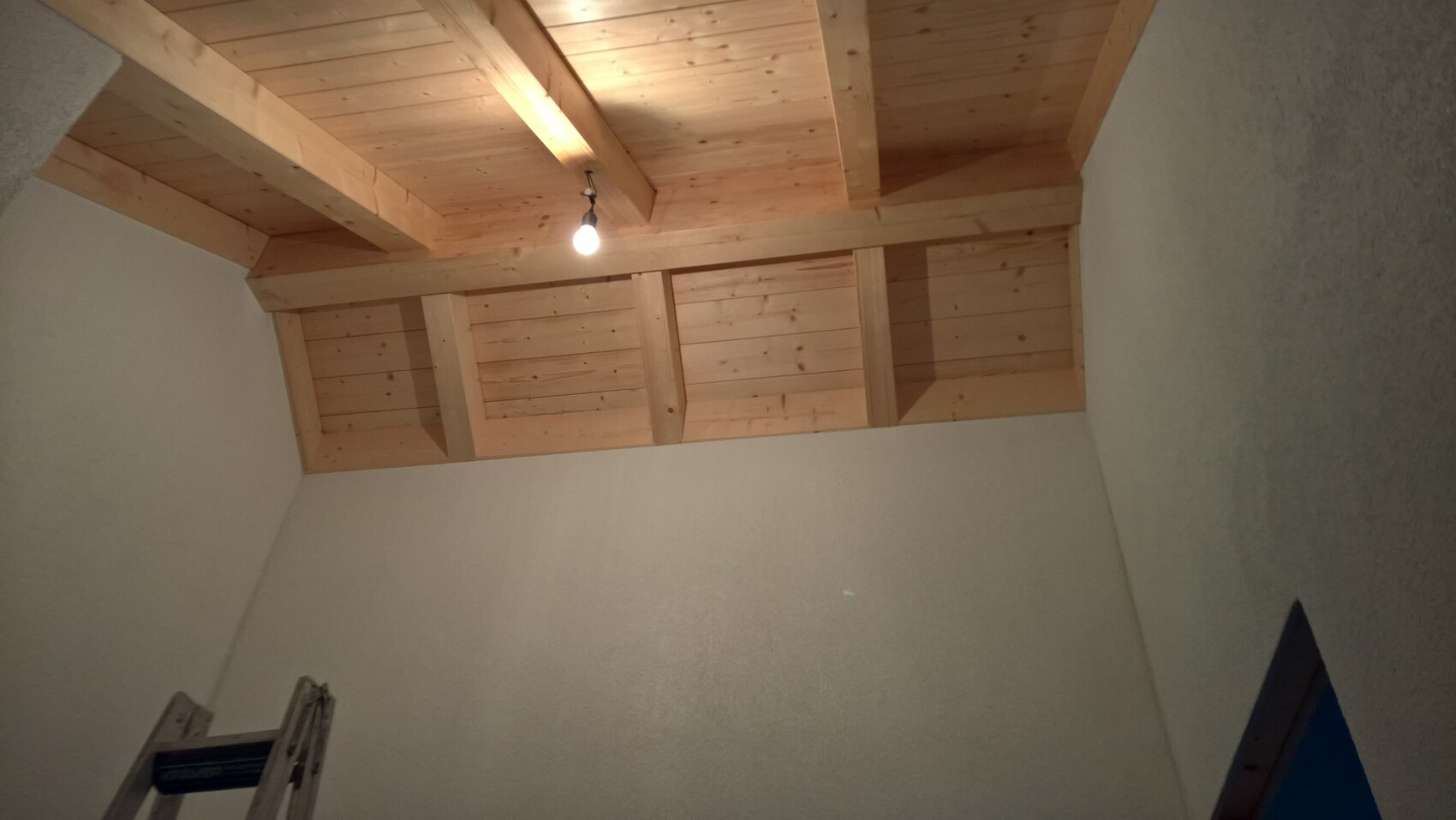 Ich habe gerade kein gutes Bild, wo ein Raum inkl. Decke bei uns zu sehen ist. Aber der Blick nach oben im Flur zeigt unsere Decke: