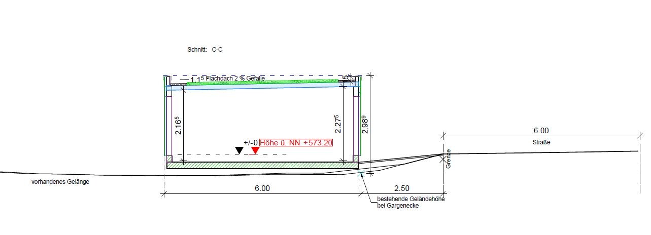 Im Anhang ein Querschnitt mit originaler Geländehöhe und Platzierung des Carports sowie die Carportfläche mit Kanaldeckeln (wir wollen das Haus bis auf 3m an die Straße schieben, das ist aktuell falsch. Und Carportdach und Eingangsüberdachung sollen eins sein).