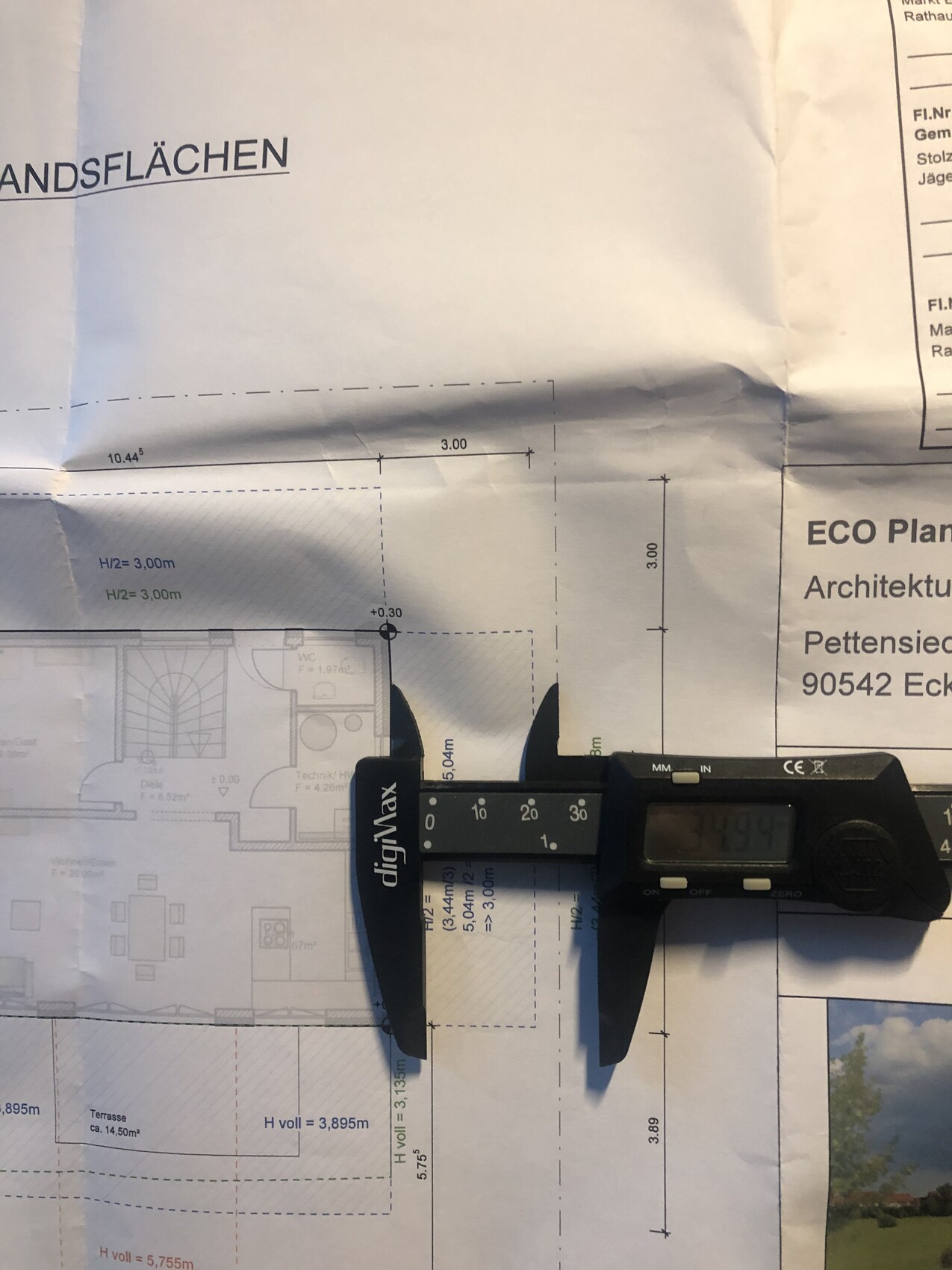 Genau, man kann ja auch deutlich die 5m zur Straße abmessen. (Mit Schieblehre: 5,04 zur Straße und 3,48 zur Grenze)