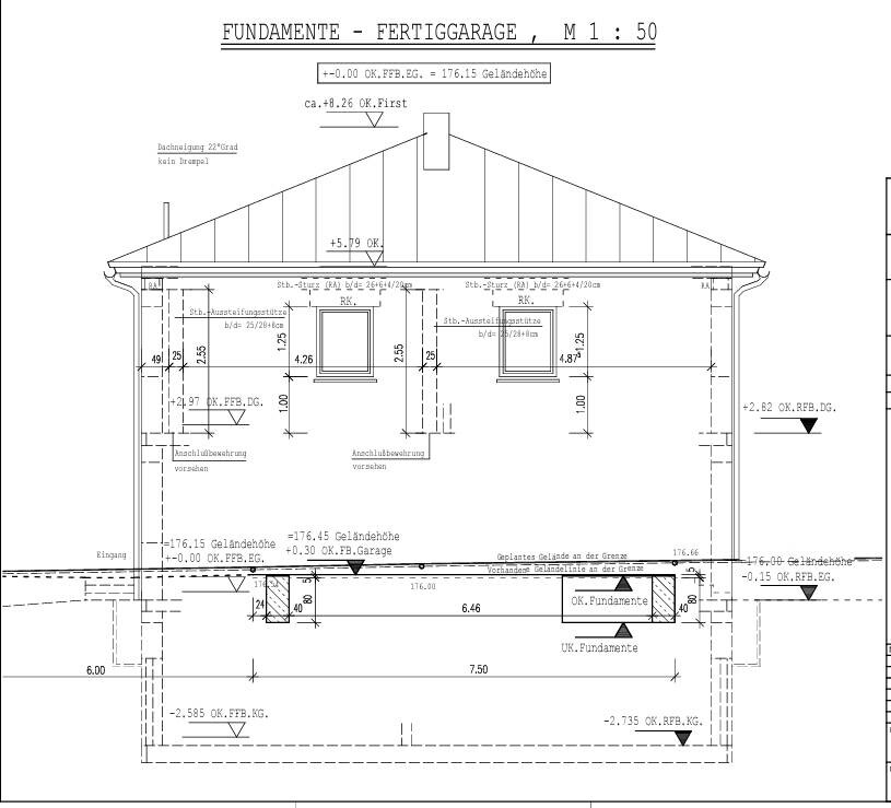 Nach deinem Planausschnitt verlief das Gelände einmal ziemlich einheitlich mit ca. 6% Gefälle. Euer Fertigfußboden EG liegt bei 176.15, eure Garage bei 176.45 und der Fertigfußboden des Nachbarn vermutlich 80cm höher. Im Bereich deiner Garage ist das geplante Gelände mit dem vorhandenen identisch eingezeichnet. Ich verstehe nicht, wo ihr wie viel abgegraben habt und warum. Wenn das nur für die Baumaßnahme war und ihr später wieder auf natürliches Geländeniveau auffüllt, geht von euch schon mal keine Störung aus. Und wie sieht das Gelände aktuell aus? Wie viel Zentimeter hat der Nachbar wie weit angeschüttet und wie sieht der Übergang zu eurem Grundstück aus?