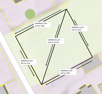 Lageplan eines Grundstücks mit Grenzlinien, Gebäuderand und Gefällehinweisen.