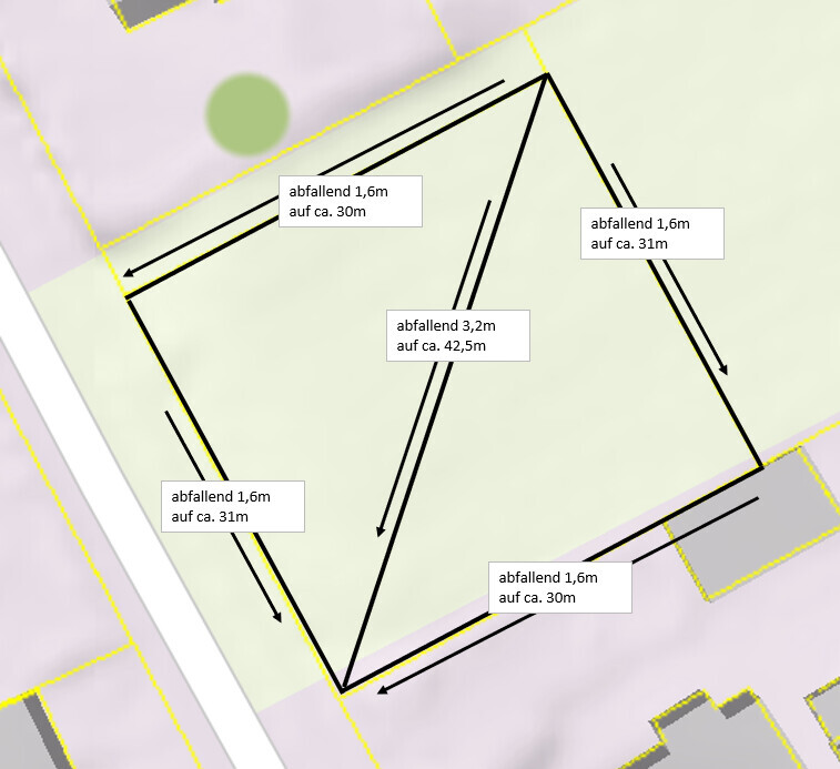 Hier noch das Grundstück mit den Höhen. Das Gelände fällt von Norden gleichmäßig in alle Richtungen ab. Höhen stammen aus dem BayernAtlas, da wir noch keinen Plan vom Kataster- oder Vermessungsamt haben.